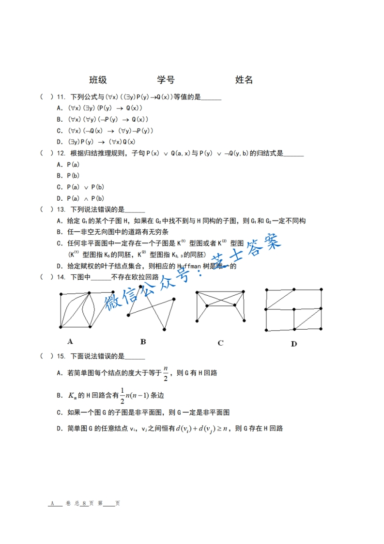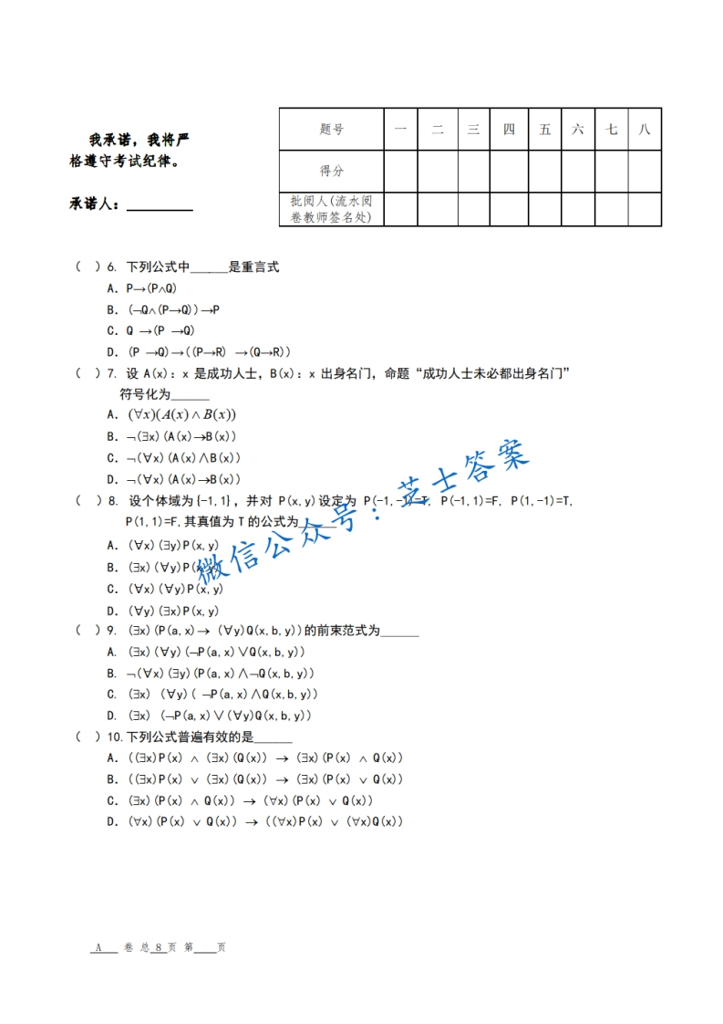 上海交通大学《离散数学》2009-2010学年第一学期期末试卷A卷猴哥6个月前发布关注私信0.97MB8页09314上海交通大学《离散数学》2009-2010学年第一学期期末试卷A卷此内容为付费资源,请付费后查看10积分年度会员免费月享会员免费登录购买付费资源已售 40 第1页 / 共8页 第2页 / 共8页 第3页 / 共8页 试读已结束,还剩5页,您可下载完整版后进行离线阅读 © 版权声明文章版权归作者所有,未经允许请勿转载。THE END《上海交通大学》期中期末历年真题期末试卷 喜欢就支持一下吧点赞14赞赏 分享QQ空间微博QQ好友海报分享复制链接收藏