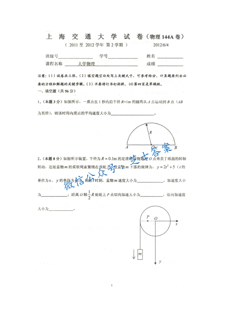 上海交通大学《大学物理》2011-2012学年第二学期期末试卷