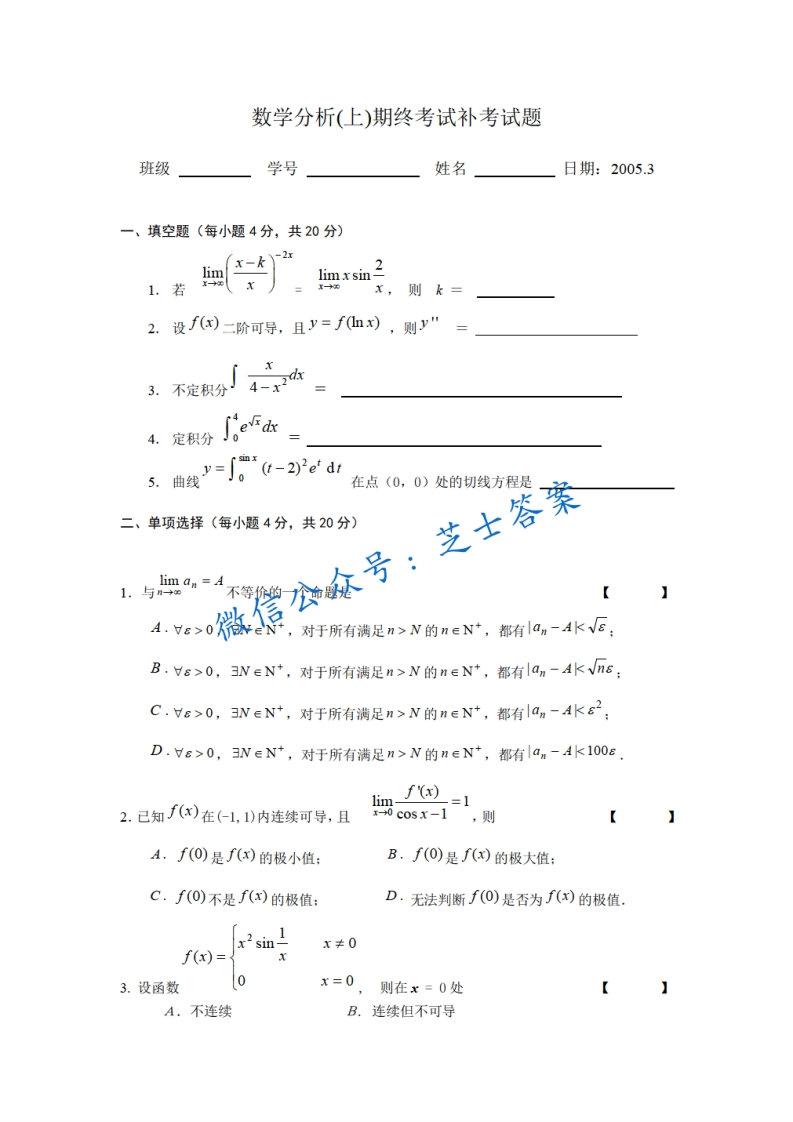 北京航空航天大学《数学分析》2004-2005学年第一学期期末试卷猴哥6个月前发布关注私信0.43MB5页04158北京航空航天大学《数学分析》2004-2005学年第一学期期末试卷此内容为付费资源,请付费后查看10积分年度会员免费月享会员免费登录购买付费资源已售 50 第1页 / 共5页 第2页 / 共5页 第3页 / 共5页 试读已结束,还剩2页,您可下载完整版后进行离线阅读 © 版权声明文章版权归作者所有,未经允许请勿转载。THE END《北京航空航天大学》期中期末历年真题期末试卷 喜欢就支持一下吧点赞58赞赏 分享QQ空间微博QQ好友海报分享复制链接收藏