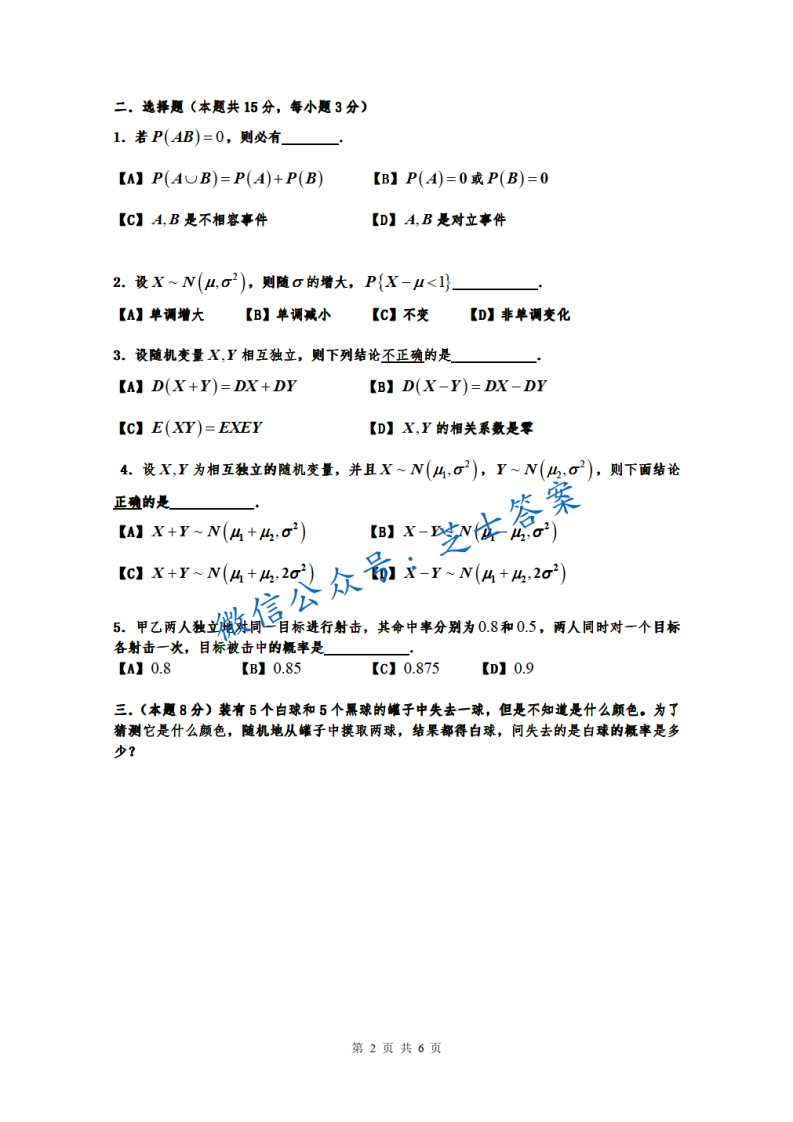 北京科技大学《概率论与数理统计》2005-2006学年第二学期期末试卷A卷猴哥6个月前发布关注私信1.34MB9页03918北京科技大学《概率论与数理统计》2005-2006学年第二学期期末试卷A卷此内容为付费资源,请付费后查看10积分年度会员免费月享会员免费登录购买付费资源已售 50 第1页 / 共9页 第2页 / 共9页 第3页 / 共9页 试读已结束,还剩6页,您可下载完整版后进行离线阅读 © 版权声明文章版权归作者所有,未经允许请勿转载。THE END期末试卷 喜欢就支持一下吧点赞18赞赏 分享QQ空间微博QQ好友海报分享复制链接收藏