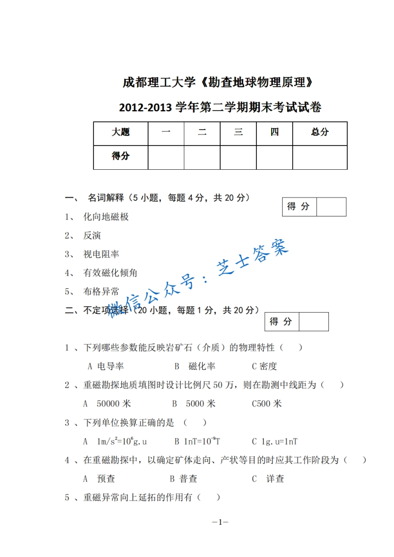 成都理工大学《勘查地球物理原理》2012-2013学年第二学期期末试卷-学习资源网 - 分享优质学习资料
