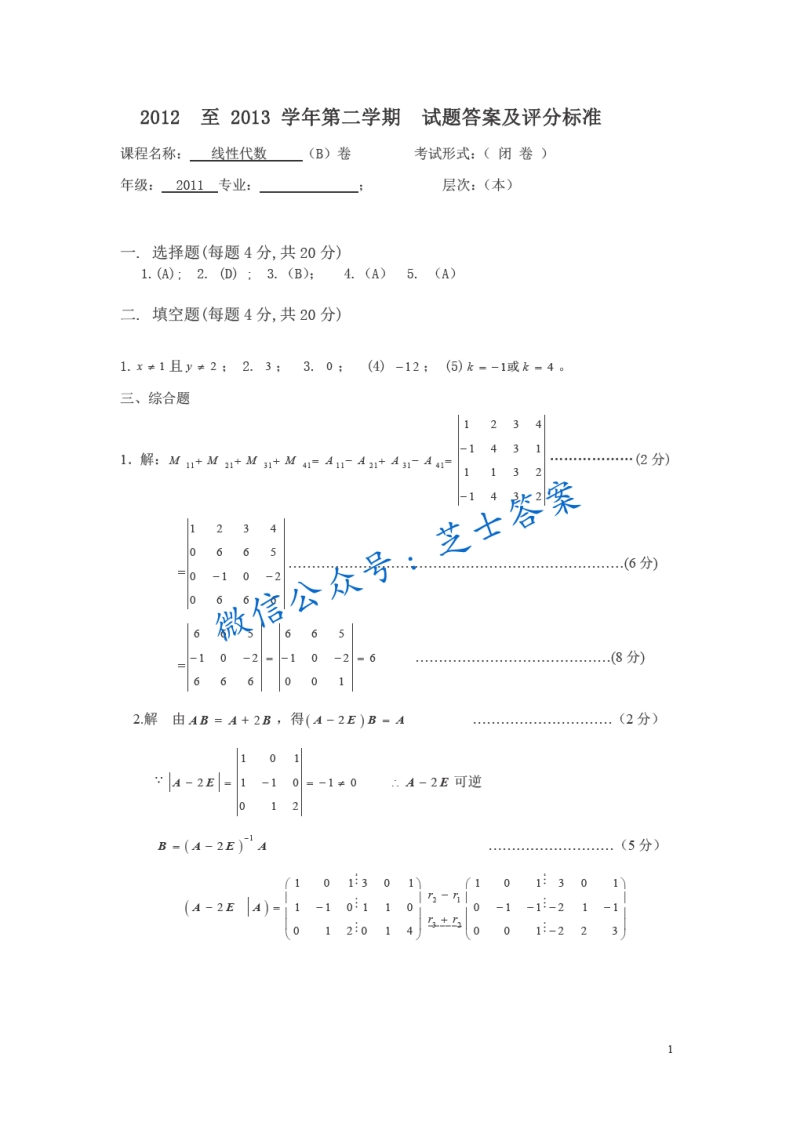 山东建筑大学《线性代数》2012-2013学年第二学期期末试卷B卷猴哥6个月前发布关注私信0.51MB5页03615山东建筑大学《线性代数》2012-2013学年第二学期期末试卷B卷此内容为付费资源,请付费后查看10积分年度会员免费月享会员免费登录购买付费资源已售 50 第1页 / 共5页 第2页 / 共5页 第3页 / 共5页 试读已结束,还剩2页,您可下载完整版后进行离线阅读 © 版权声明文章版权归作者所有,未经允许请勿转载。THE END《山东建筑大学》期中期末历年真题期末试卷 喜欢就支持一下吧点赞15赞赏 分享QQ空间微博QQ好友海报分享复制链接收藏