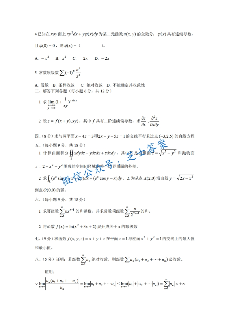 山东理工大学《高等数学》2007-2008学年第二学期期末试卷猴哥6个月前发布关注私信0.37MB3页03919山东理工大学《高等数学》2007-2008学年第二学期期末试卷此内容为付费资源,请付费后查看10积分年度会员免费月享会员免费登录购买付费资源已售 50 第1页 / 共3页 第2页 / 共3页 第3页 / 共3页 已完成全部阅读,共3页 © 版权声明文章版权归作者所有,未经允许请勿转载。THE END《山东理工大学》期中期末历年真题期末试卷 喜欢就支持一下吧点赞19赞赏 分享QQ空间微博QQ好友海报分享复制链接收藏