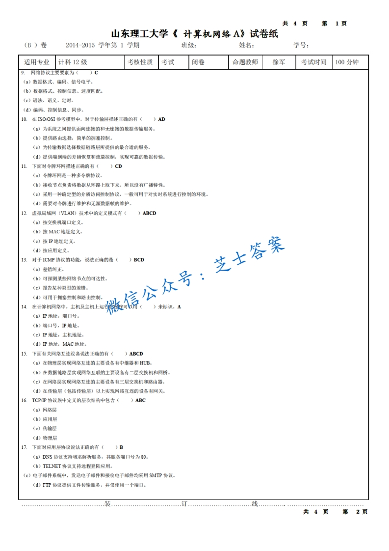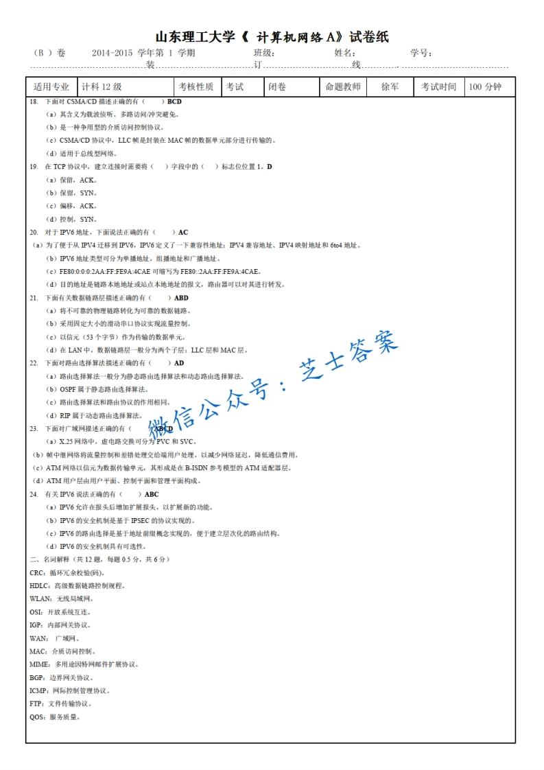 山东理工大学《计算机网络》2014-2015学年第一学期期末试卷B卷猴哥6个月前发布关注私信0.99MB4页06021山东理工大学《计算机网络》2014-2015学年第一学期期末试卷B卷此内容为付费资源,请付费后查看10积分年度会员免费月享会员免费登录购买付费资源已售 50 第1页 / 共4页 第2页 / 共4页 第3页 / 共4页 试读已结束,还剩1页,您可下载完整版后进行离线阅读 © 版权声明文章版权归作者所有,未经允许请勿转载。THE END《山东理工大学》期中期末历年真题期末试卷 喜欢就支持一下吧点赞21赞赏 分享QQ空间微博QQ好友海报分享复制链接收藏