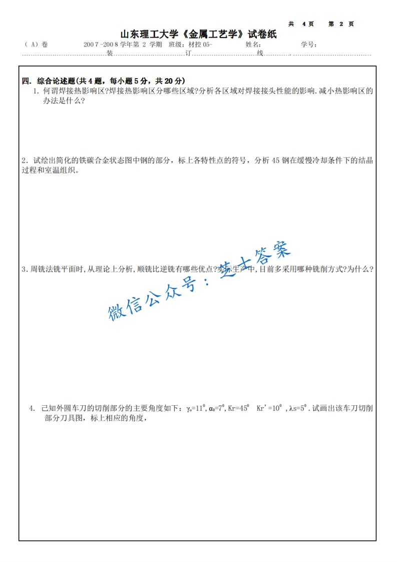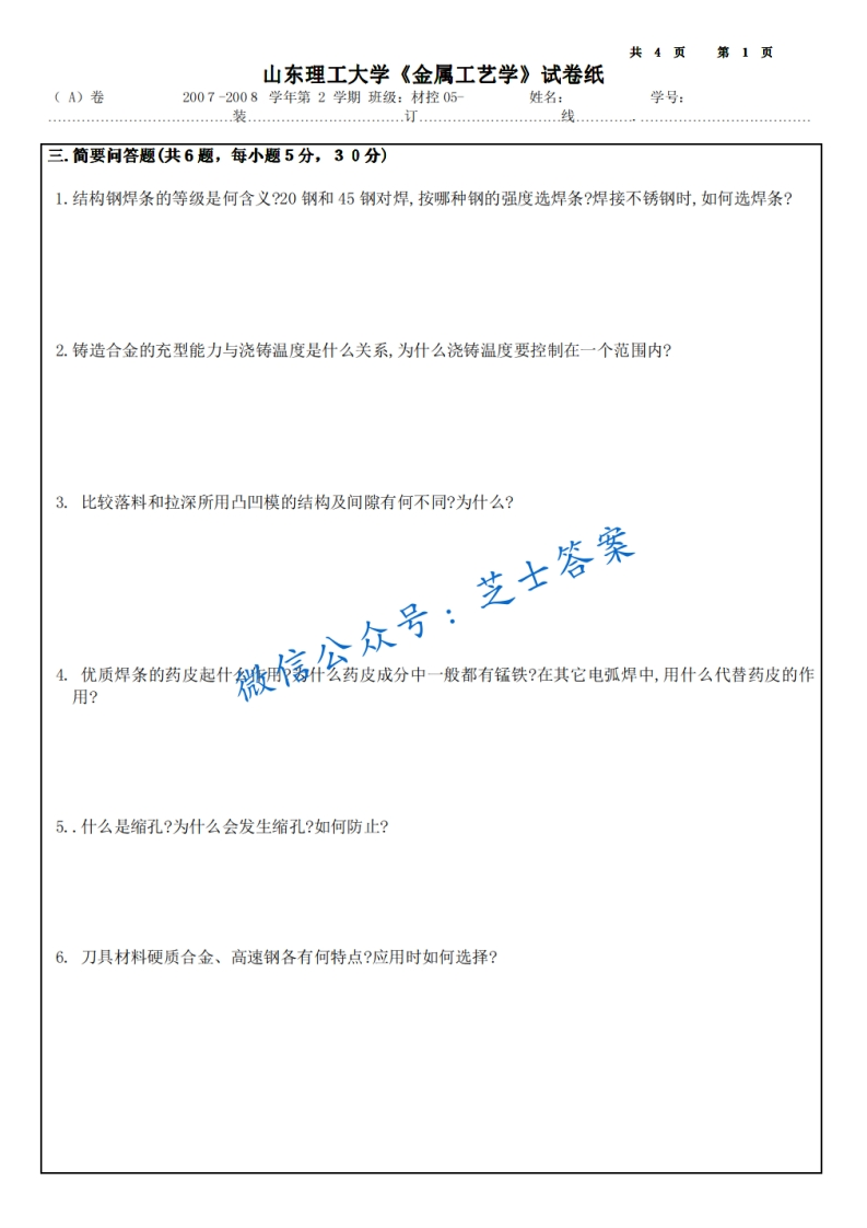 山东理工大学《金属工艺学》2007-2008学年第二学期期末试卷A卷猴哥6个月前发布关注私信0.70MB4页03228山东理工大学《金属工艺学》2007-2008学年第二学期期末试卷A卷此内容为付费资源,请付费后查看10积分年度会员免费月享会员免费登录购买付费资源已售 50 第1页 / 共4页 第2页 / 共4页 第3页 / 共4页 试读已结束,还剩1页,您可下载完整版后进行离线阅读 © 版权声明文章版权归作者所有,未经允许请勿转载。THE END《山东理工大学》期中期末历年真题期末试卷 喜欢就支持一下吧点赞28赞赏 分享QQ空间微博QQ好友海报分享复制链接收藏