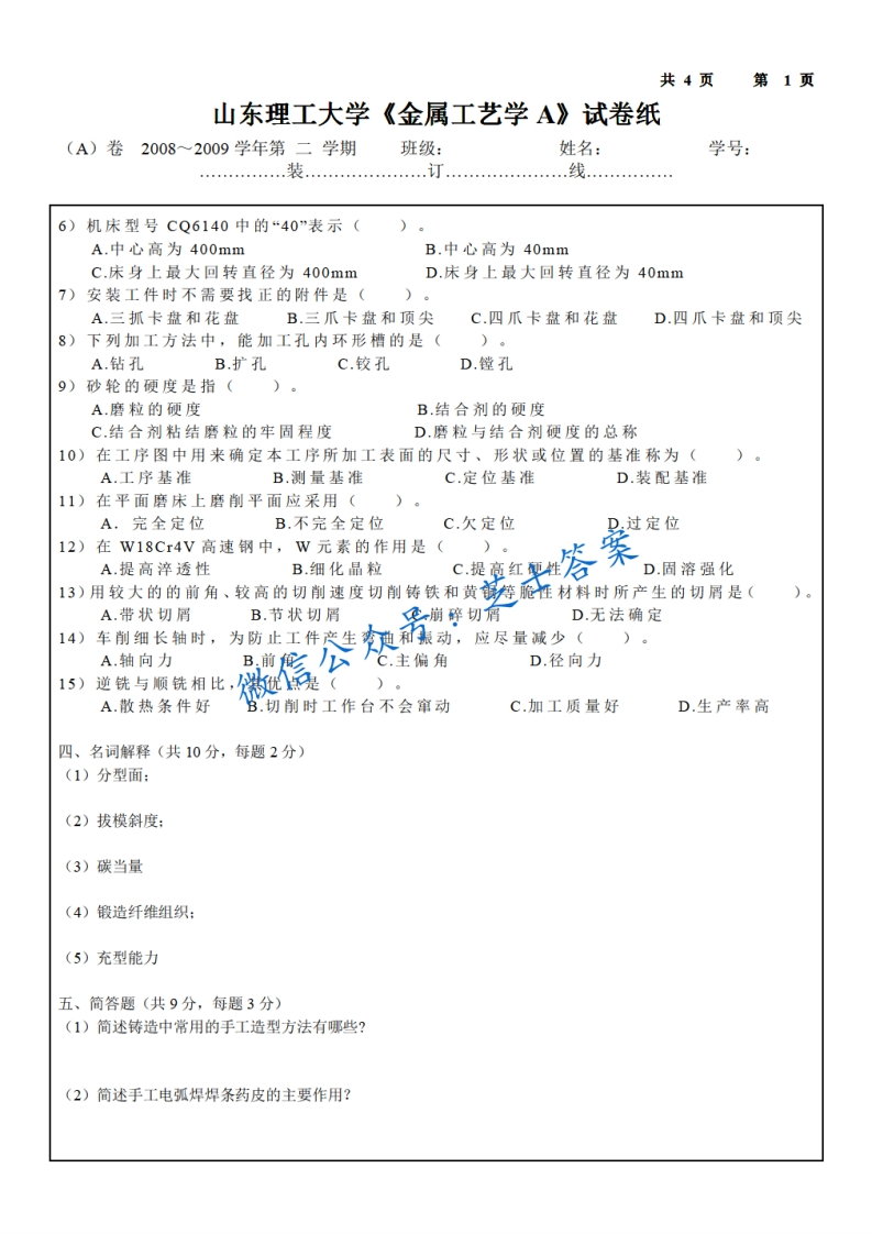 山东理工大学《金属工艺学》2009-2010学年第一学期期末试卷A卷猴哥6个月前发布关注私信0.99MB5页05428山东理工大学《金属工艺学》2009-2010学年第一学期期末试卷A卷此内容为付费资源,请付费后查看10积分年度会员免费月享会员免费登录购买付费资源已售 50 第1页 / 共5页 第2页 / 共5页 第3页 / 共5页 试读已结束,还剩2页,您可下载完整版后进行离线阅读 © 版权声明文章版权归作者所有,未经允许请勿转载。THE END《山东理工大学》期中期末历年真题期末试卷 喜欢就支持一下吧点赞28赞赏 分享QQ空间微博QQ好友海报分享复制链接收藏
