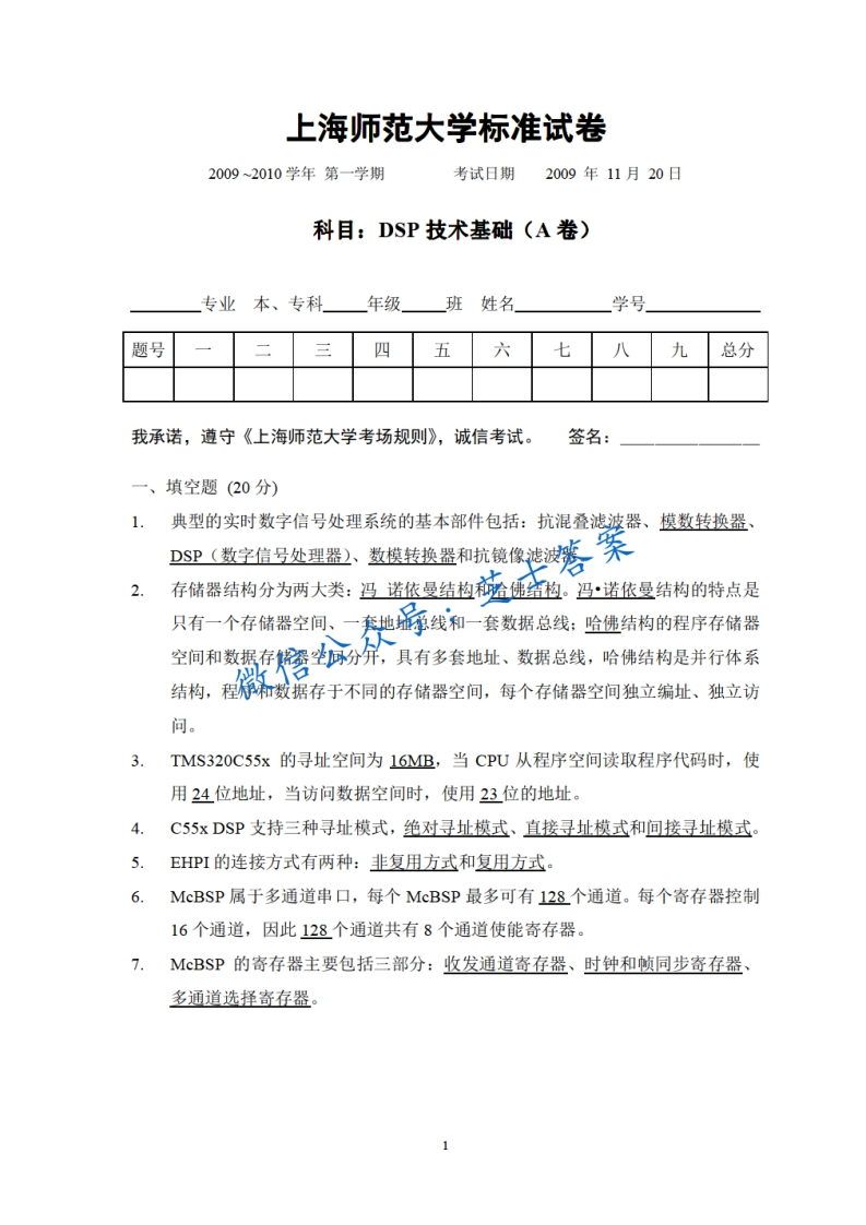 上海师范大学《DSP技术及应用》2009-2010学年第一学期期末试卷A卷-学习资源网 - 分享优质学习资料
