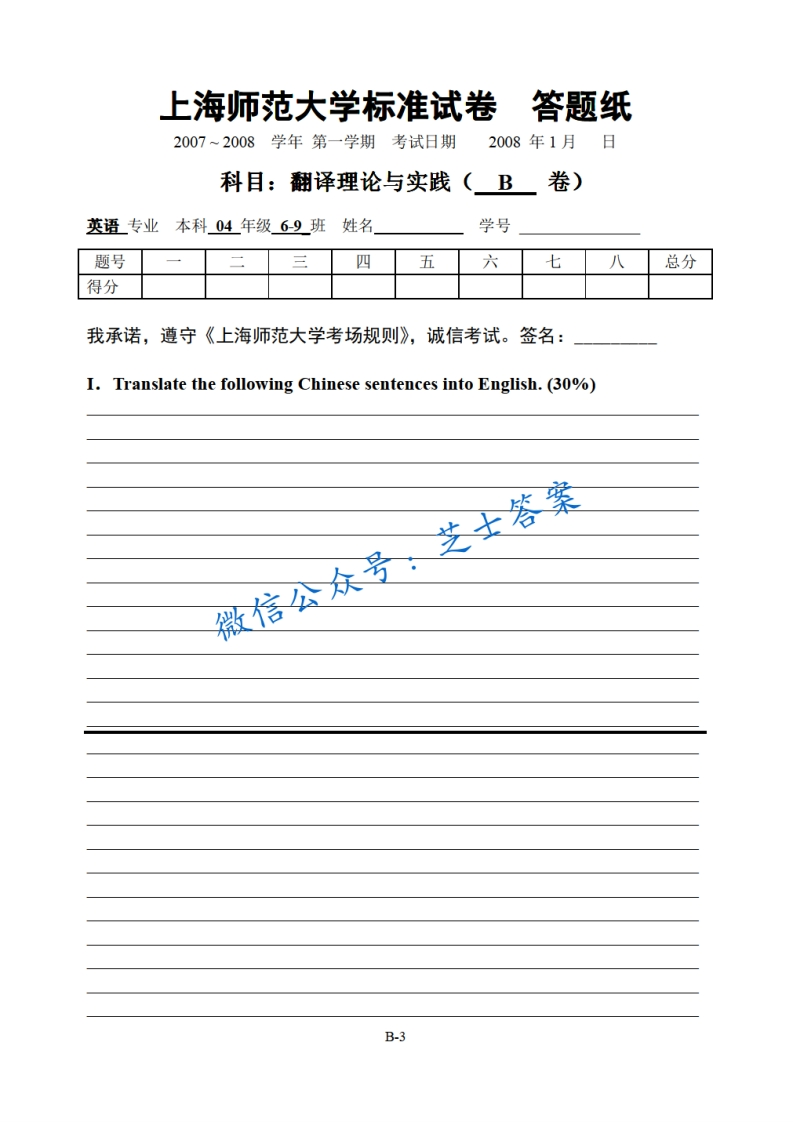 上海师范大学《翻译理论与实践》2007-2008学年第一学期期末试卷B卷-学习资源网 - 分享优质学习资料