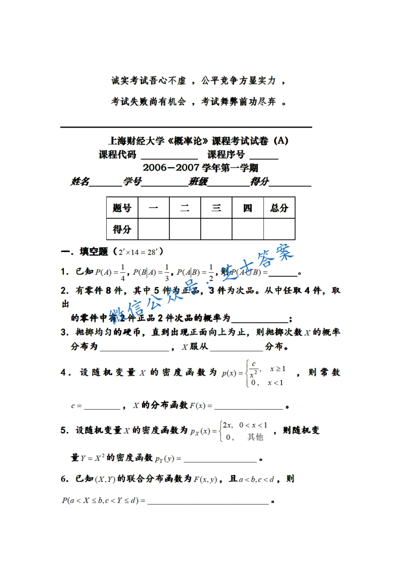 上海财经大学《概率论与数理统计》2005-2006学年第一学期期末试卷A卷猴哥6个月前更新关注私信0.92MB9页01W+947上海财经大学《概率论与数理统计》2005-2006学年第一学期期末试卷A卷此内容为付费资源,请付费后查看10积分年度会员免费月享会员免费登录购买付费资源已售 76 第1页 / 共9页 第2页 / 共9页 第3页 / 共9页 试读已结束,还剩6页,您可下载完整版后进行离线阅读 © 版权声明文章版权归作者所有,未经允许请勿转载。THE END《上海财经大学》期中期末历年真题期末试卷 喜欢就支持一下吧点赞947赞赏 分享QQ空间微博QQ好友海报分享复制链接收藏