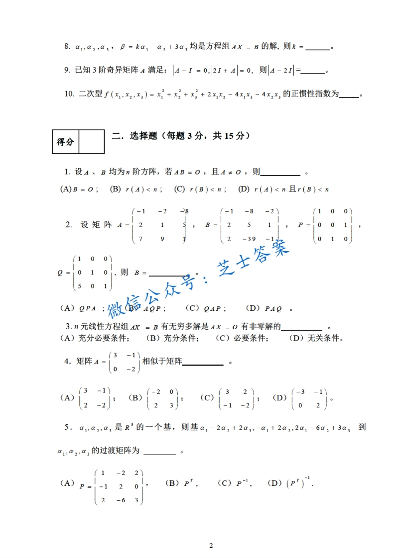 上海财经大学《线性代数》2007-2008学年第二学期期末试卷A卷猴哥6个月前更新关注私信0.54MB6页01W+944上海财经大学《线性代数》2007-2008学年第二学期期末试卷A卷此内容为付费资源,请付费后查看10积分年度会员免费月享会员免费登录购买付费资源已售 76 第1页 / 共6页 第2页 / 共6页 第3页 / 共6页 试读已结束,还剩3页,您可下载完整版后进行离线阅读 © 版权声明文章版权归作者所有,未经允许请勿转载。THE END《上海财经大学》期中期末历年真题期末试卷 喜欢就支持一下吧点赞944赞赏 分享QQ空间微博QQ好友海报分享复制链接收藏