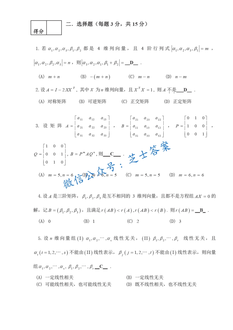 上海财经大学《线性代数》2013-2014学年第一学期期末试卷A卷猴哥6个月前更新关注私信0.61MB5页01W+964上海财经大学《线性代数》2013-2014学年第一学期期末试卷A卷此内容为付费资源,请付费后查看10积分年度会员免费月享会员免费登录购买付费资源已售 76 第1页 / 共5页 第2页 / 共5页 第3页 / 共5页 试读已结束,还剩2页,您可下载完整版后进行离线阅读 © 版权声明文章版权归作者所有,未经允许请勿转载。THE END《上海财经大学》期中期末历年真题期末试卷 喜欢就支持一下吧点赞964赞赏 分享QQ空间微博QQ好友海报分享复制链接收藏