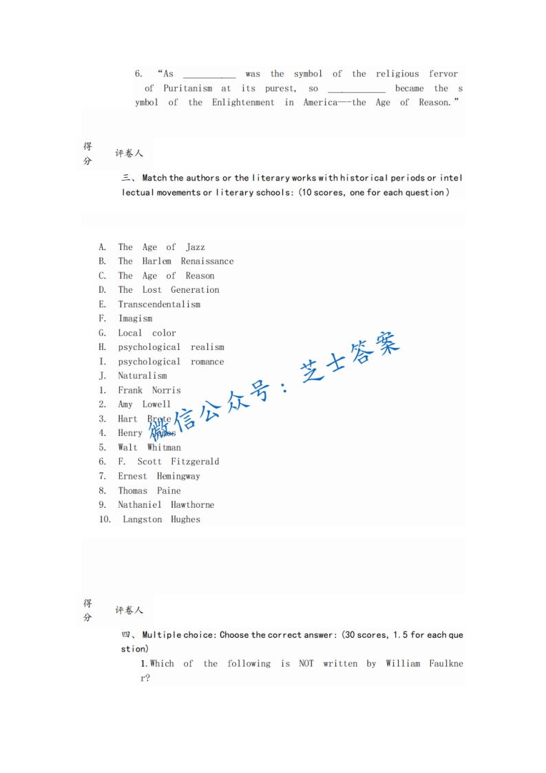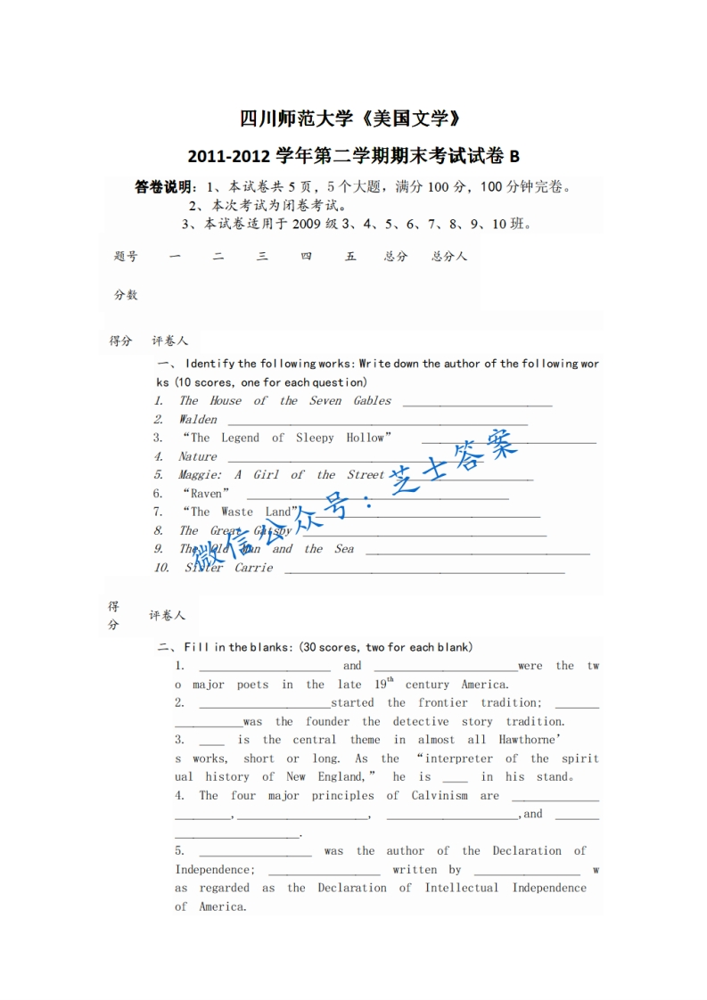 四川师范大学《美国文学》2011-2012学年第二学期期末试卷B卷-学习资源网 - 分享优质学习资料