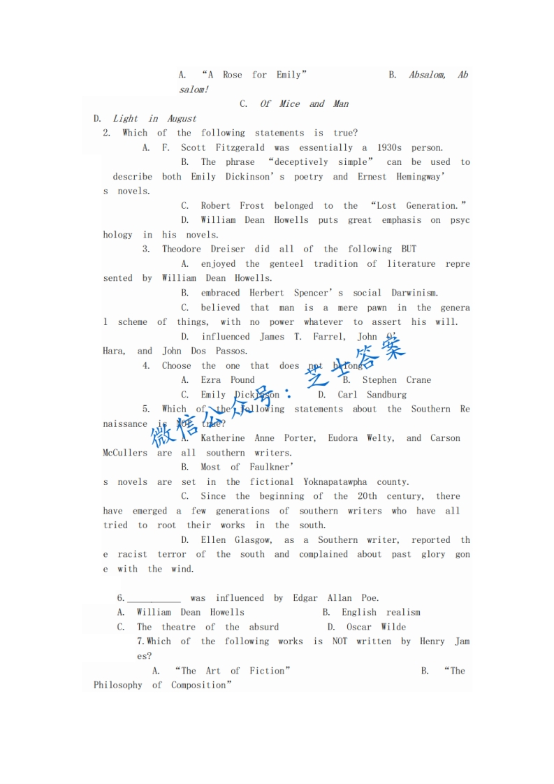 四川师范大学《美国文学》2011-2012学年第二学期期末试卷B卷