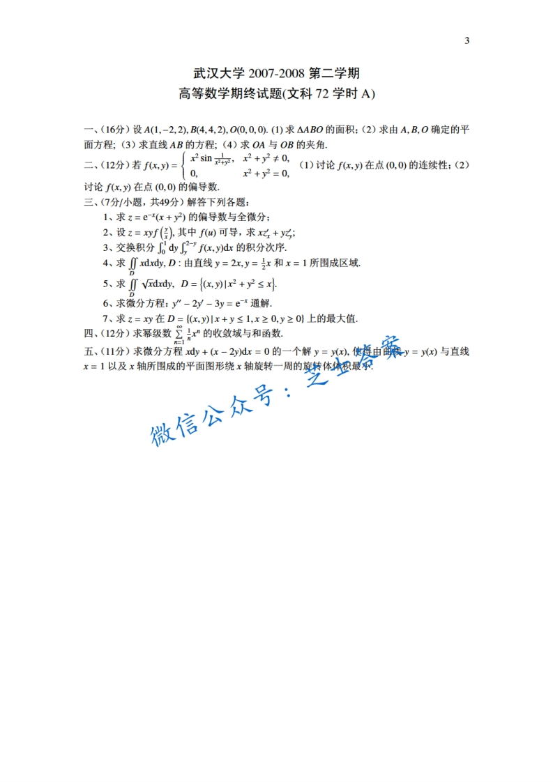 武汉大学《高等数学》2007-2008学年第二学期期末试卷A卷猴哥6个月前发布关注私信0.67MB3页08531武汉大学《高等数学》2007-2008学年第二学期期末试卷A卷此内容为付费资源,请付费后查看10积分年度会员免费月享会员免费登录购买付费资源已售 50 第1页 / 共3页 第2页 / 共3页 第3页 / 共3页 已完成全部阅读,共3页 © 版权声明文章版权归作者所有,未经允许请勿转载。THE END《武汉大学》期中期末历年真题期末试卷 喜欢就支持一下吧点赞31赞赏 分享QQ空间微博QQ好友海报分享复制链接收藏