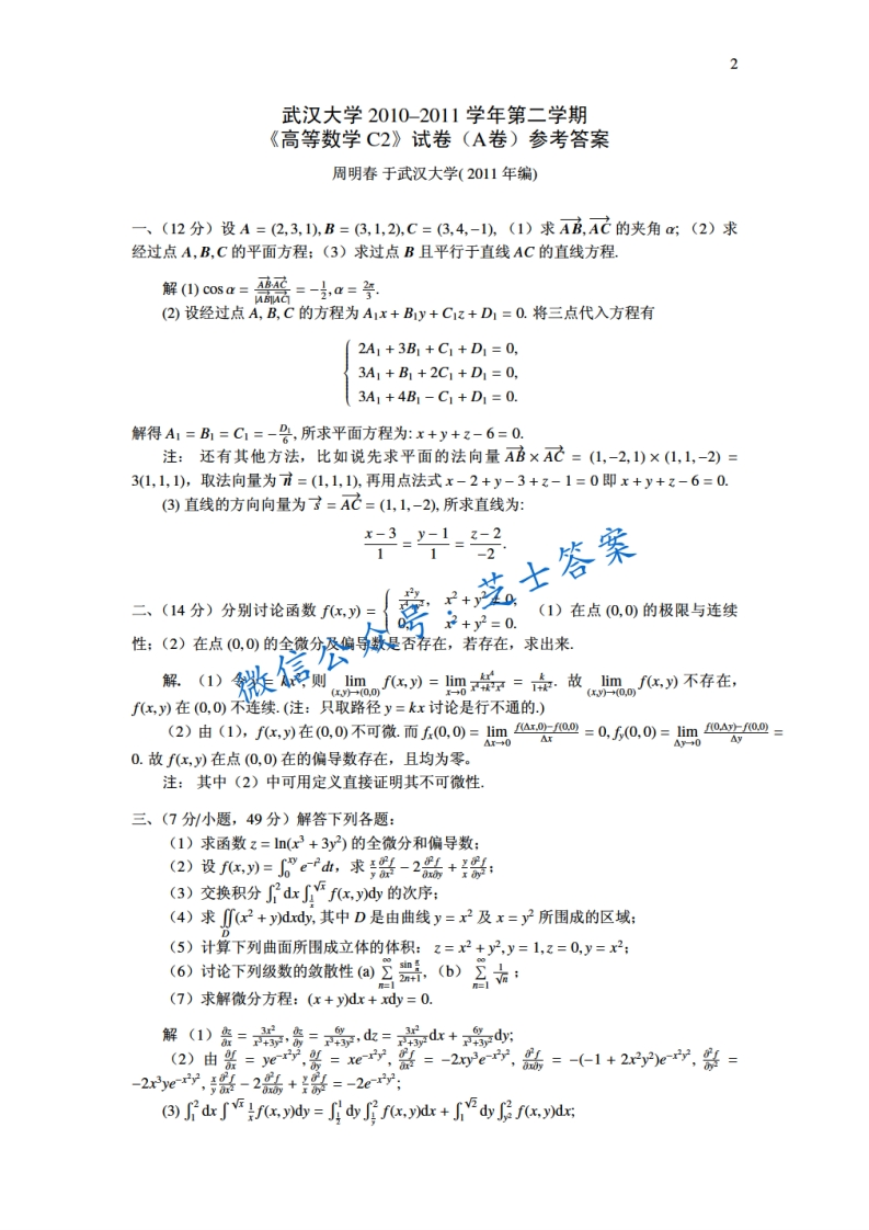 武汉大学《高等数学C》2010-2011学年第二学期期末试卷A卷-学习资源网 - 分享优质学习资料