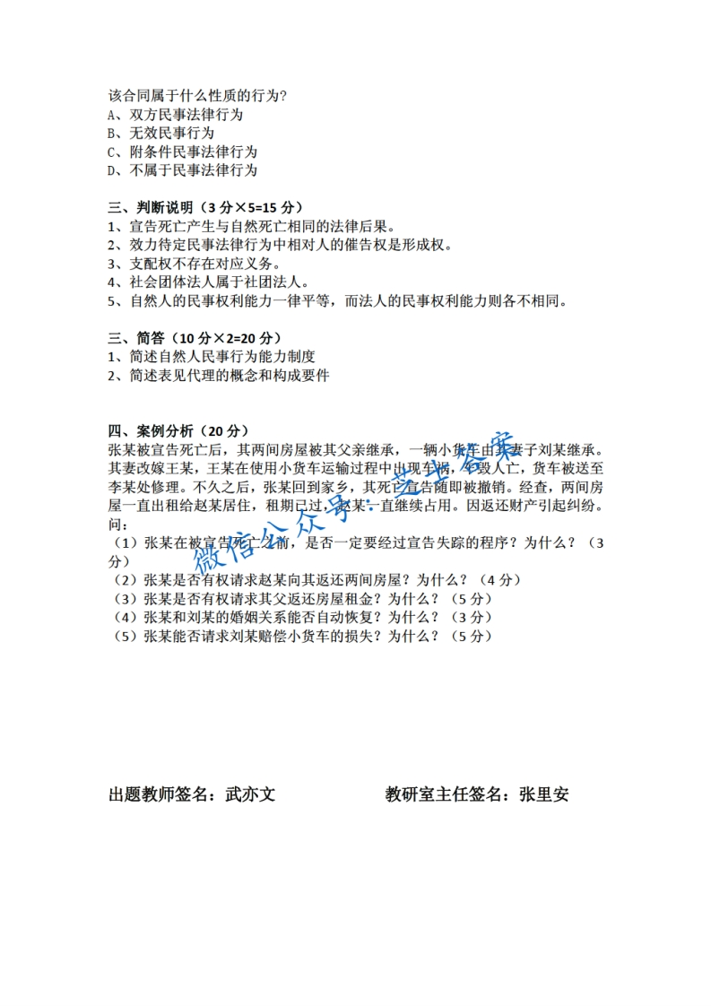 武汉大学《民法总论》2011-2012学年第一学期期末试卷A卷-学习资源网 - 分享优质学习资料