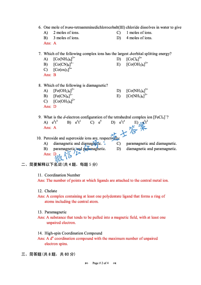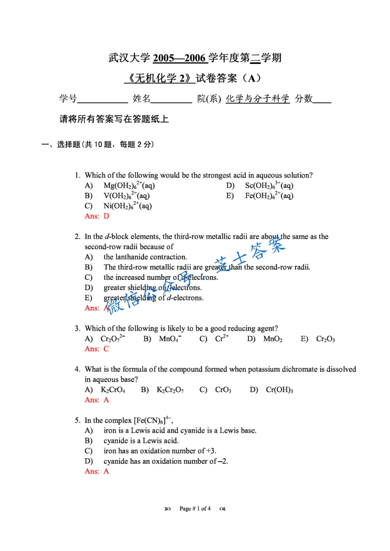 武汉大学《无机化学》2005-2006学年第二学期期末试卷A卷-学习资源网 - 分享优质学习资料