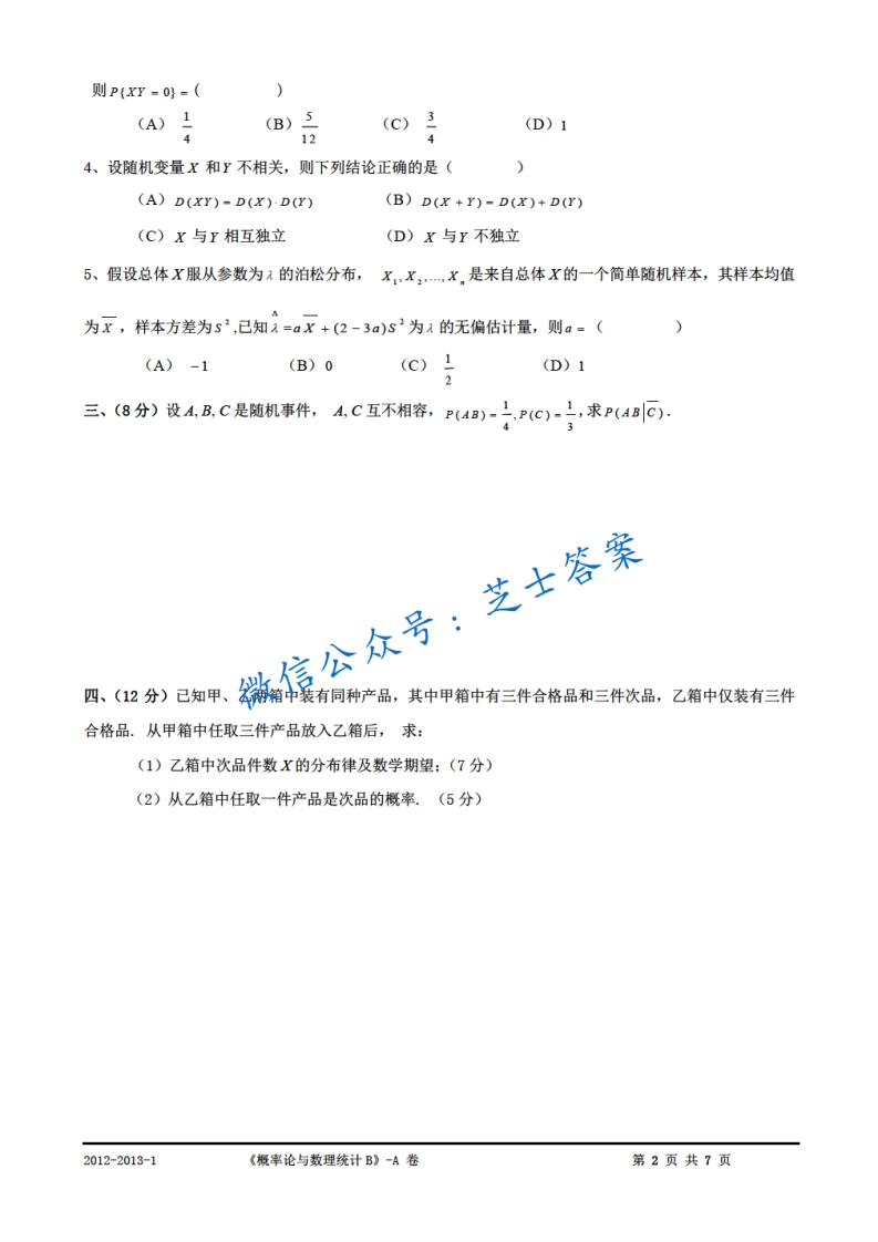 西南科技大学《概率论与数理统计》2012-2013学年第一学期期末试卷A卷猴哥6个月前发布关注私信0.92MB7页03750西南科技大学《概率论与数理统计》2012-2013学年第一学期期末试卷A卷此内容为付费资源,请付费后查看10积分年度会员免费月享会员免费登录购买付费资源已售 50 第1页 / 共7页 第2页 / 共7页 第3页 / 共7页 试读已结束,还剩4页,您可下载完整版后进行离线阅读 © 版权声明文章版权归作者所有,未经允许请勿转载。THE END《西南科技大学》期中期末历年真题期末试卷 喜欢就支持一下吧点赞50赞赏 分享QQ空间微博QQ好友海报分享复制链接收藏