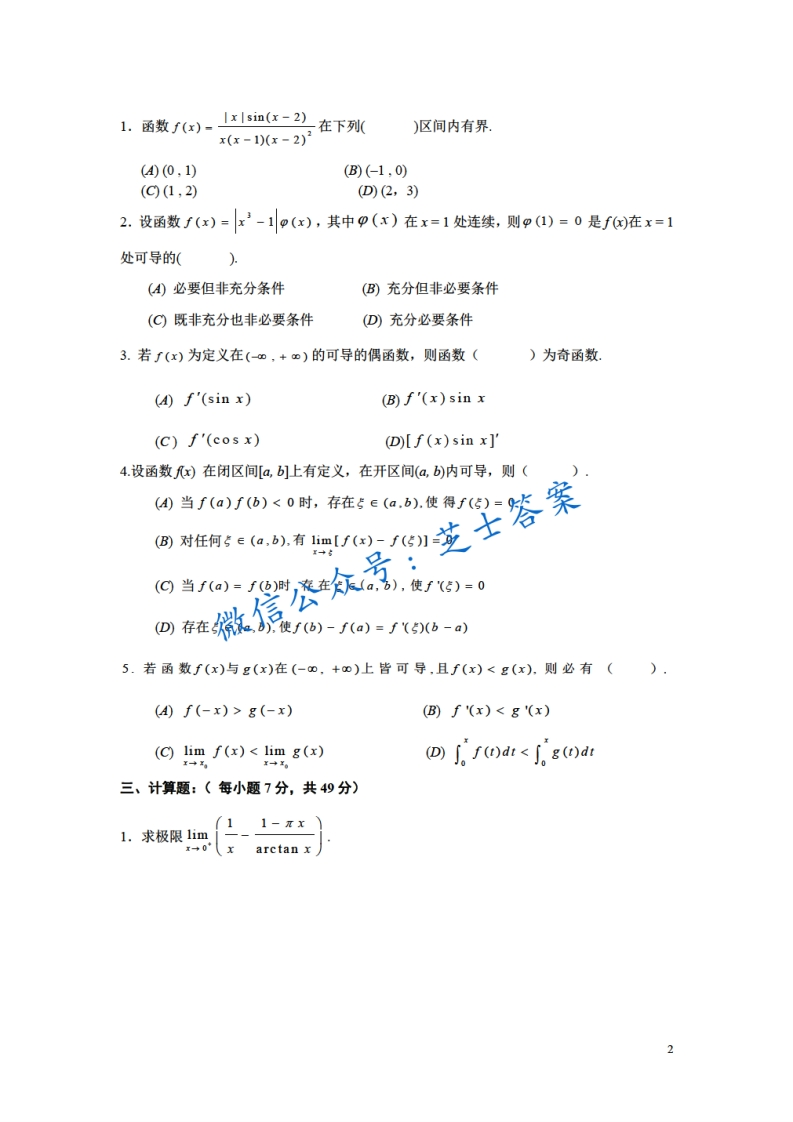 西南科技大学《高等数学Ⅰ》2013-2014学年第一学期期末试卷A卷猴哥6个月前发布关注私信0.86MB8页08822西南科技大学《高等数学Ⅰ》2013-2014学年第一学期期末试卷A卷此内容为付费资源,请付费后查看10积分年度会员免费月享会员免费登录购买付费资源已售 50 第1页 / 共8页 第2页 / 共8页 第3页 / 共8页 试读已结束,还剩5页,您可下载完整版后进行离线阅读 © 版权声明文章版权归作者所有,未经允许请勿转载。THE END《西南科技大学》期中期末历年真题期末试卷 喜欢就支持一下吧点赞22赞赏 分享QQ空间微博QQ好友海报分享复制链接收藏