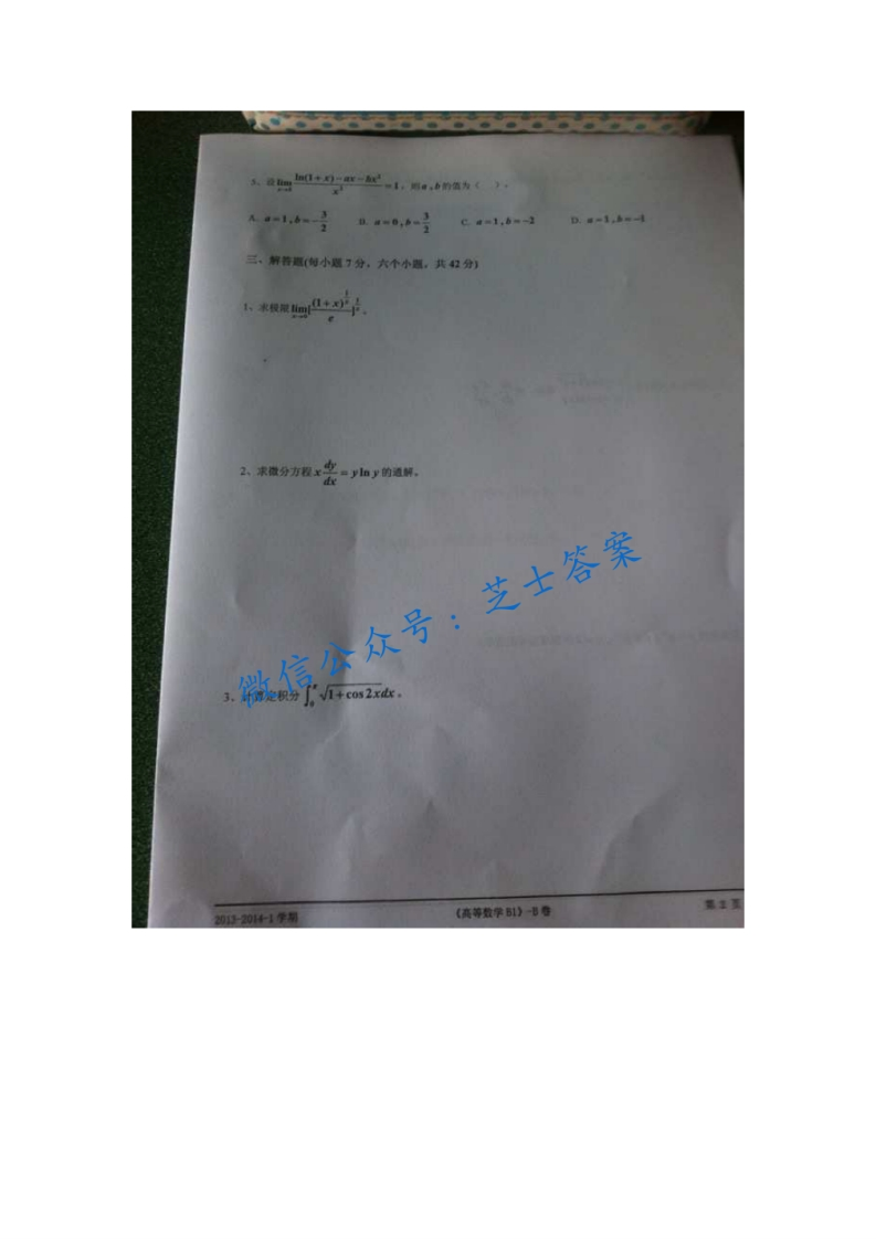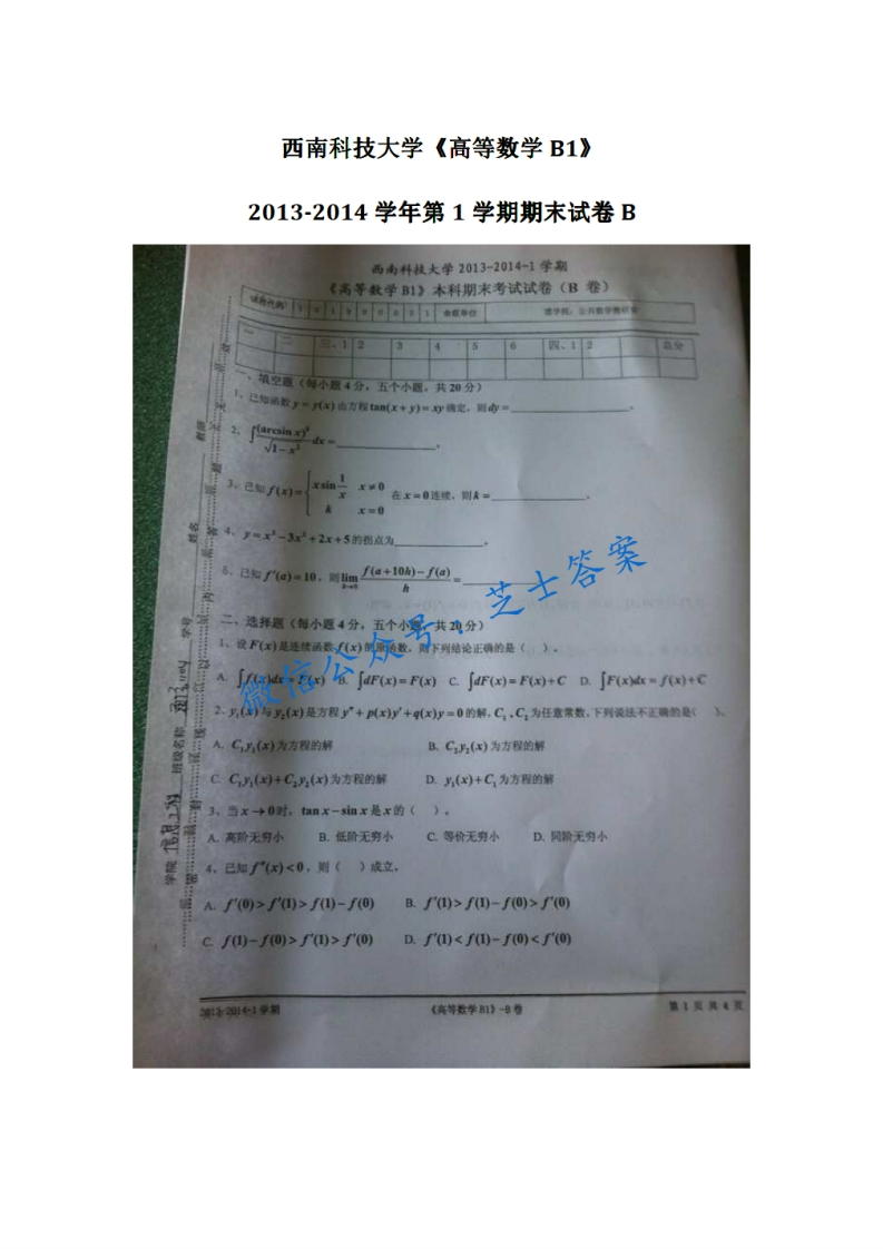 西南科技大学《高等数学B1》2013-2014学年第一学期期末试卷B卷-学习资源网 - 分享优质学习资料