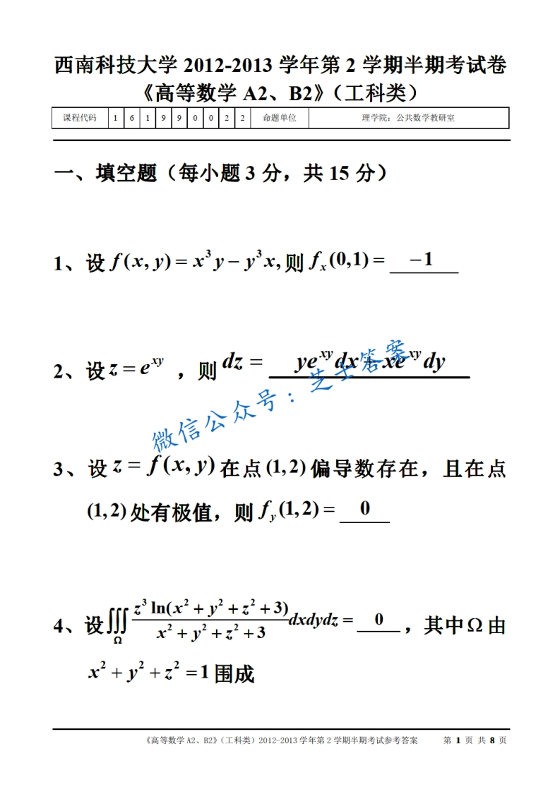西南科技大学《高等数学下》2012-2013学年第二学期期中试卷