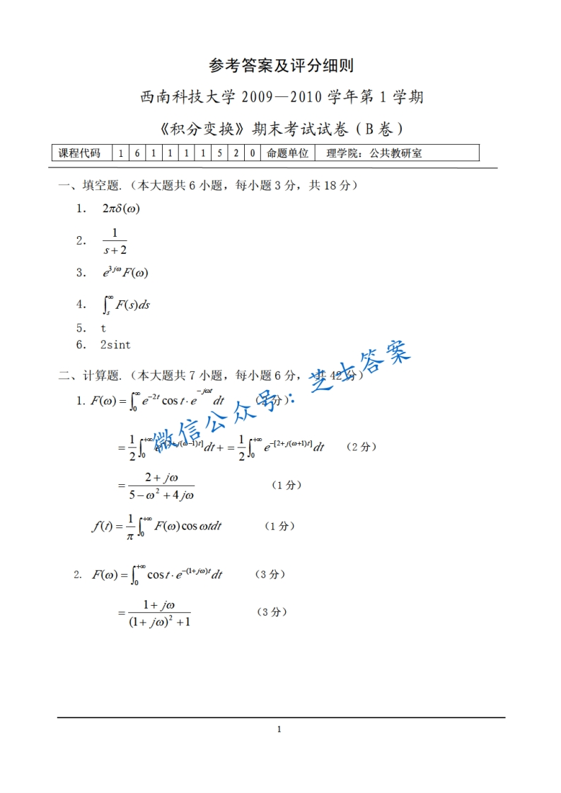西南科技大学《积分变换》2009-2010学年第一学期期末试卷B卷