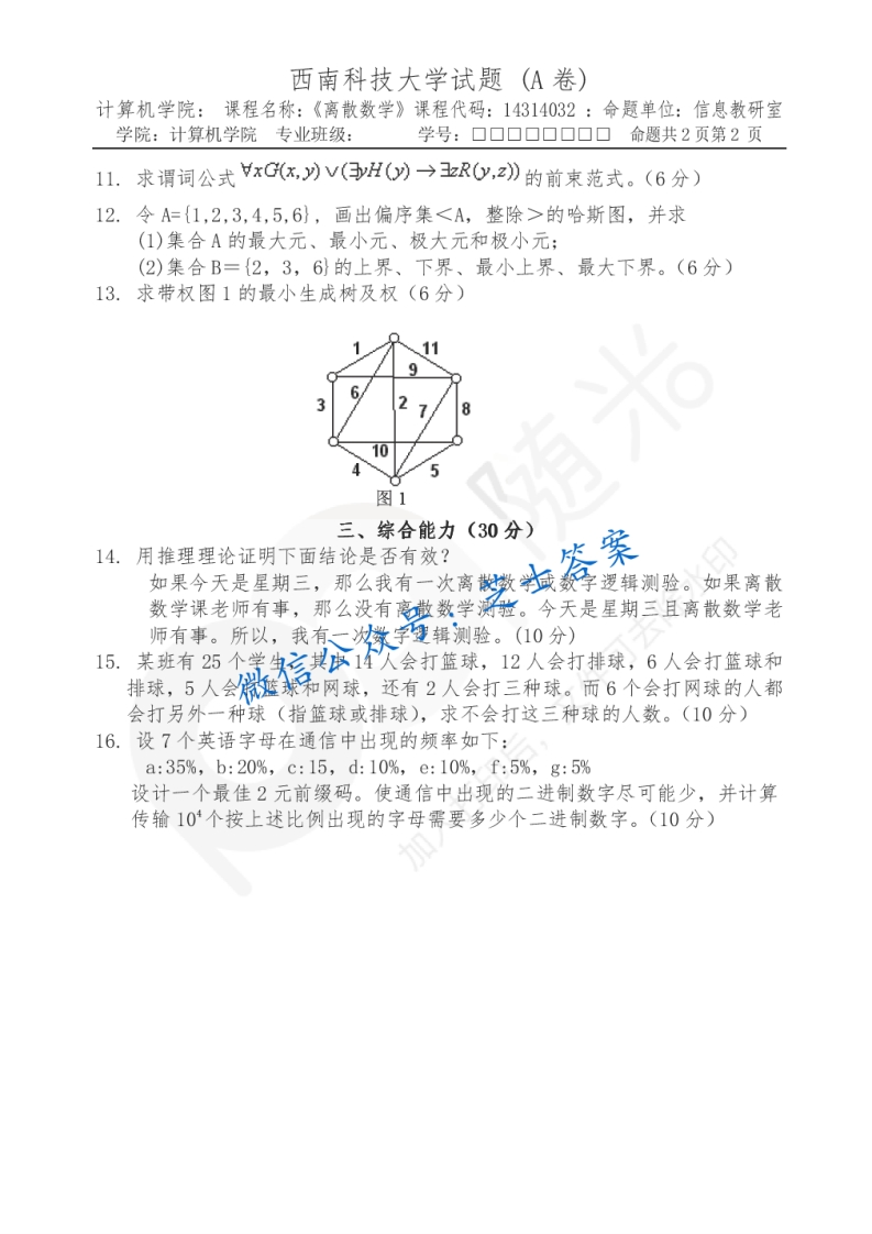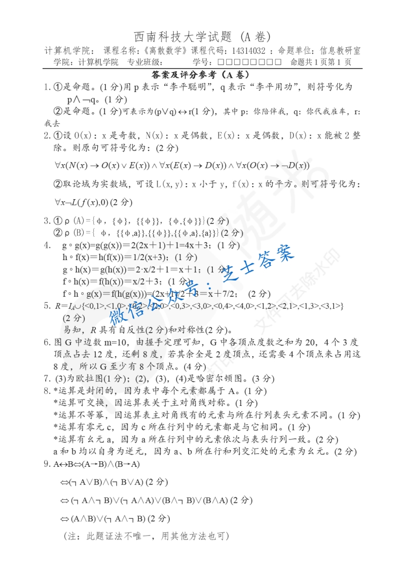 西南科技大学《离散数学》2005-2006学年第二学期期末试卷A卷猴哥6个月前发布关注私信1.08MB5页04632西南科技大学《离散数学》2005-2006学年第二学期期末试卷A卷此内容为付费资源,请付费后查看10积分年度会员免费月享会员免费登录购买付费资源已售 50 第1页 / 共5页 第2页 / 共5页 第3页 / 共5页 试读已结束,还剩2页,您可下载完整版后进行离线阅读 © 版权声明文章版权归作者所有,未经允许请勿转载。THE END《西南科技大学》期中期末历年真题期末试卷 喜欢就支持一下吧点赞32赞赏 分享QQ空间微博QQ好友海报分享复制链接收藏