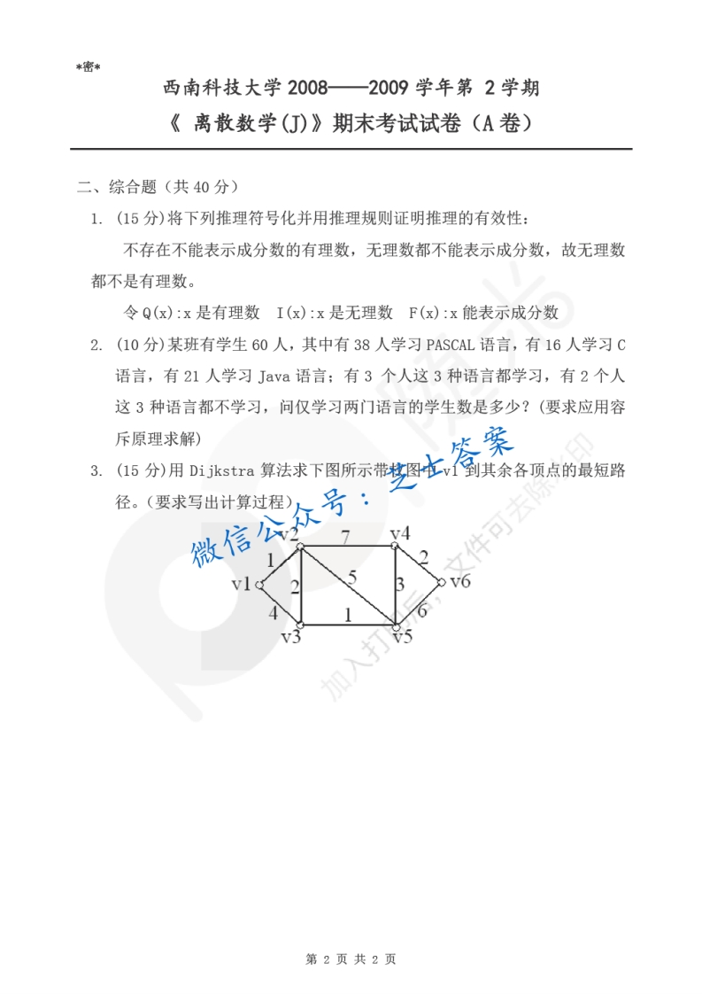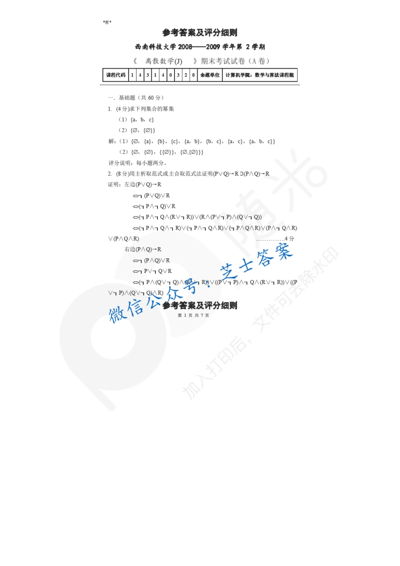 西南科技大学《离散数学》2008-2009学年第二学期期末试卷A卷猴哥6个月前发布关注私信1.13MB9页04328西南科技大学《离散数学》2008-2009学年第二学期期末试卷A卷此内容为付费资源,请付费后查看10积分年度会员免费月享会员免费登录购买付费资源已售 50 第1页 / 共9页 第2页 / 共9页 第3页 / 共9页 试读已结束,还剩6页,您可下载完整版后进行离线阅读 © 版权声明文章版权归作者所有,未经允许请勿转载。THE END《西南科技大学》期中期末历年真题期末试卷 喜欢就支持一下吧点赞28赞赏 分享QQ空间微博QQ好友海报分享复制链接收藏