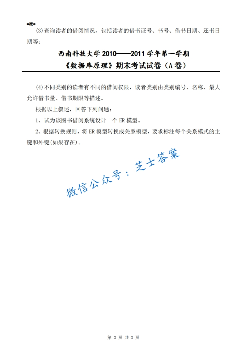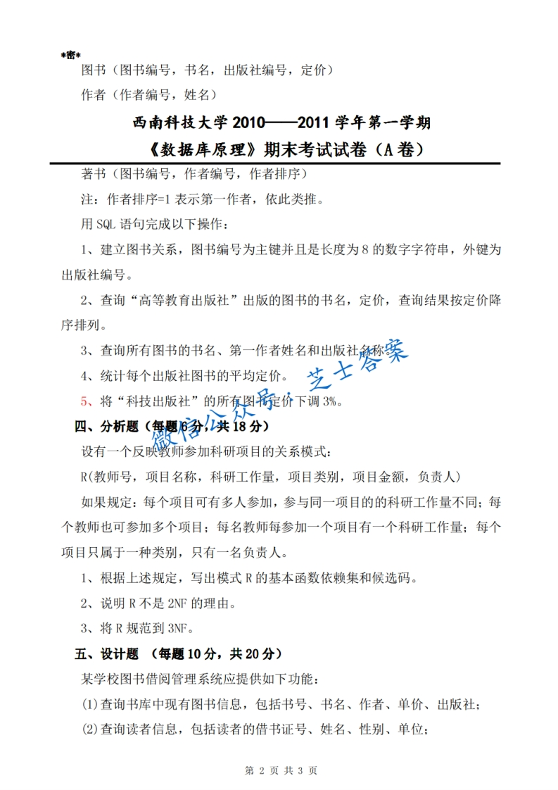 西南科技大学《数据库原理》2010-2011学年第一学期期末试卷A卷-学习资源网 - 分享优质学习资料