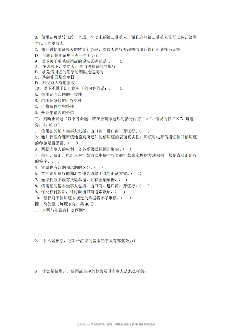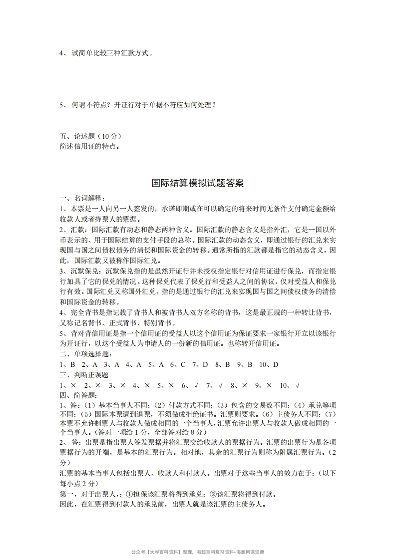 国际结算模拟试题及答案猴哥6个月前发布关注私信0.24MB5页07839国际结算模拟试题及答案此内容为免费资源,请登录后查看¥0 登录查看免费资源 第1页 / 共5页 第2页 / 共5页 第3页 / 共5页 该文档为免费文档,您可直接下载完整版进行阅读 © 版权声明文章版权归作者所有,未经允许请勿转载。THE END《国际结算》学习资料合集 期末复习 喜欢就支持一下吧点赞39赞赏 分享QQ空间微博QQ好友海报分享复制链接收藏