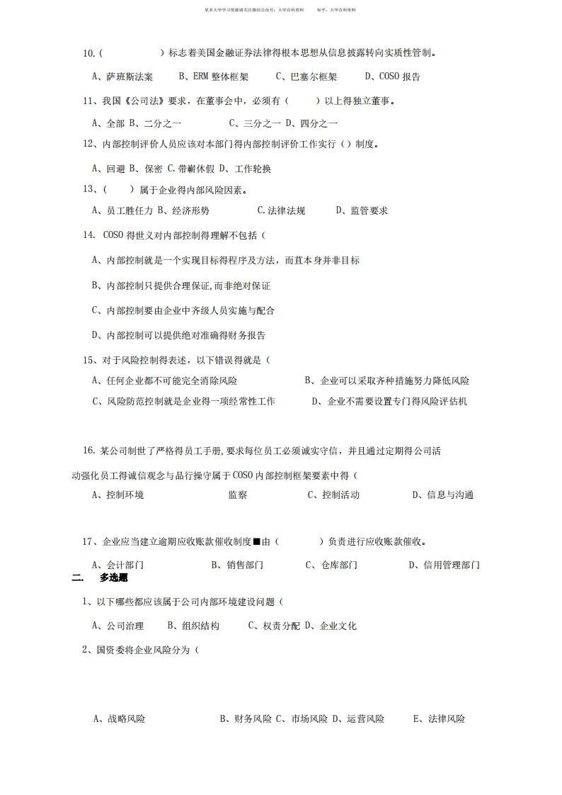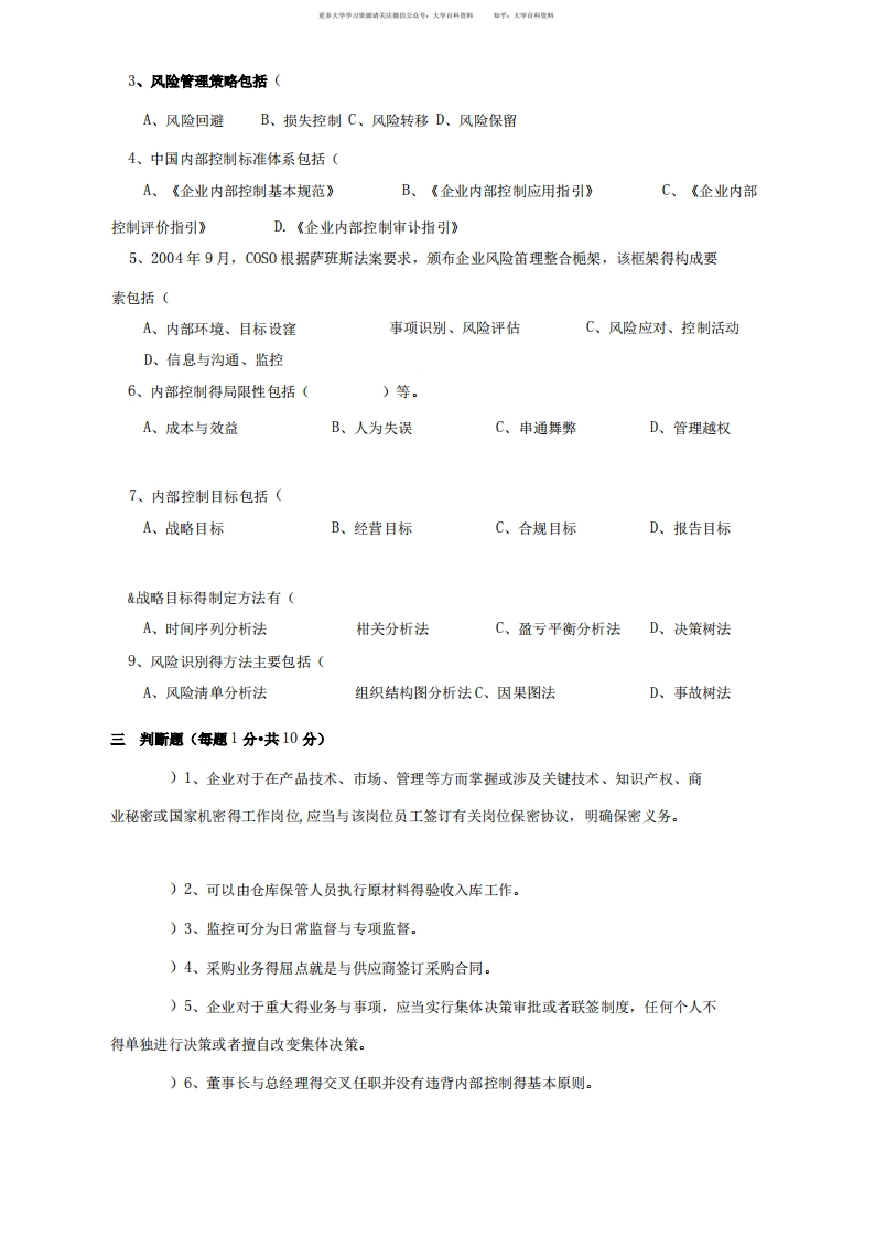 内部控制与风险管理复习题猴哥6个月前发布关注私信0.39MB9页08134内部控制与风险管理复习题此内容为免费资源,请登录后查看¥0 登录查看免费资源 第1页 / 共9页 第2页 / 共9页 第3页 / 共9页 该文档为免费文档,您可直接下载完整版进行阅读 © 版权声明文章版权归作者所有,未经允许请勿转载。THE END《内部控制与风险管理》学习资料合集 期末复习 喜欢就支持一下吧点赞34赞赏 分享QQ空间微博QQ好友海报分享复制链接收藏