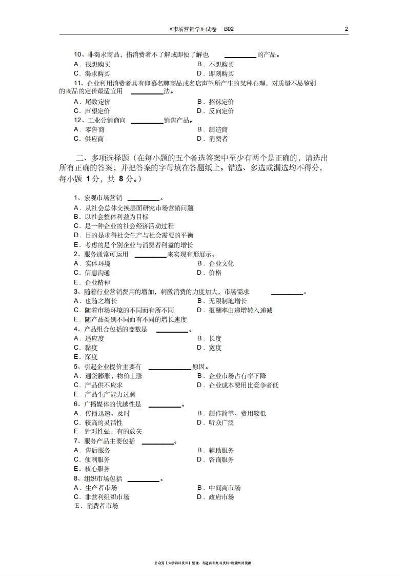 市场营销学试题及其答案(吴健安)(11)猴哥6个月前发布关注私信0.13MB7页09548市场营销学试题及其答案(吴健安)(11)此内容为免费资源,请登录后查看¥0 登录查看免费资源 第1页 / 共7页 第2页 / 共7页 第3页 / 共7页 该文档为免费文档,您可直接下载完整版进行阅读 © 版权声明文章版权归作者所有,未经允许请勿转载。THE END《市场营销学》学习资料合集 期末复习 喜欢就支持一下吧点赞48赞赏 分享QQ空间微博QQ好友海报分享复制链接收藏