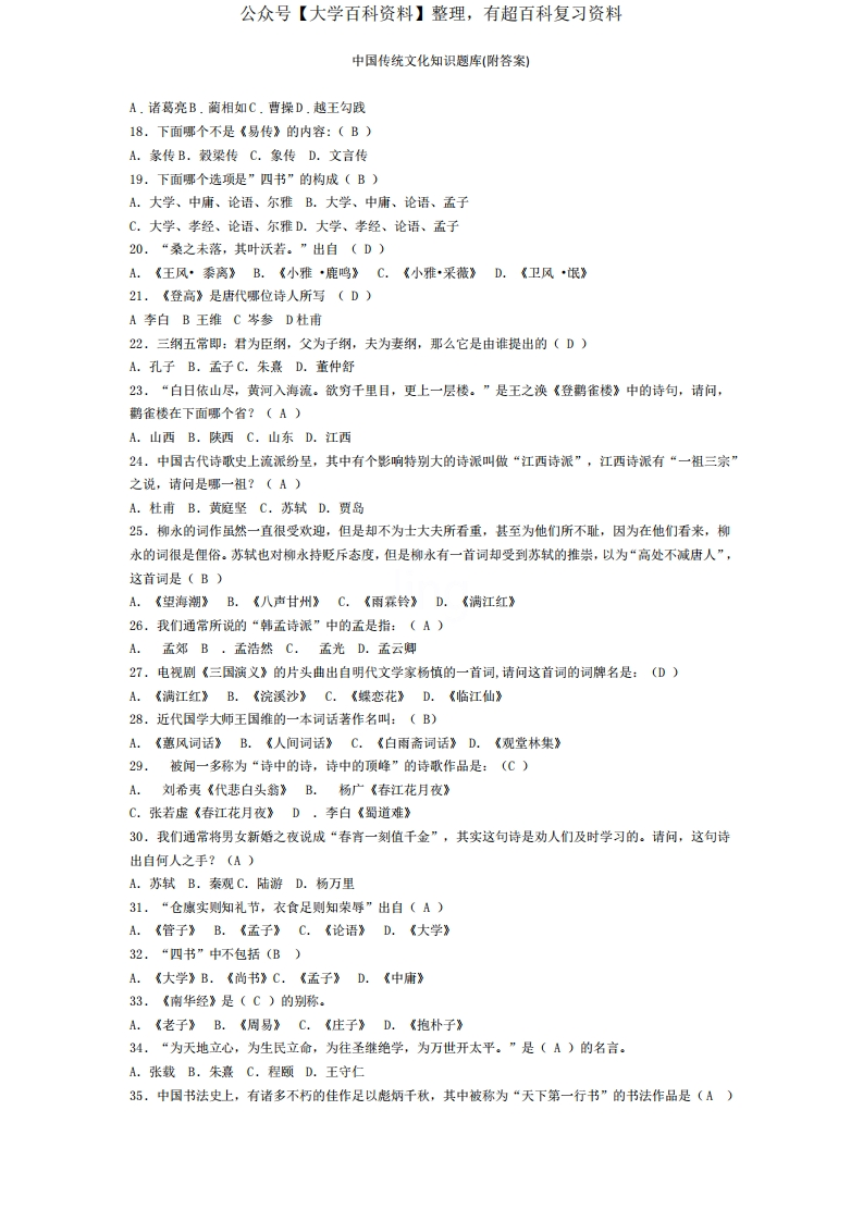 中国传统文化知识题库(附答案)猴哥6个月前发布关注私信0.87MB11页05020中国传统文化知识题库(附答案)此内容为免费资源,请登录后查看¥0 登录查看免费资源 第1页 / 共11页 第2页 / 共11页 第3页 / 共11页 该文档为免费文档,您可直接下载完整版进行阅读 © 版权声明文章版权归作者所有,未经允许请勿转载。THE END《中国传统文化之传统节日》学习资料合集 期末复习 喜欢就支持一下吧点赞20赞赏 分享QQ空间微博QQ好友海报分享复制链接收藏