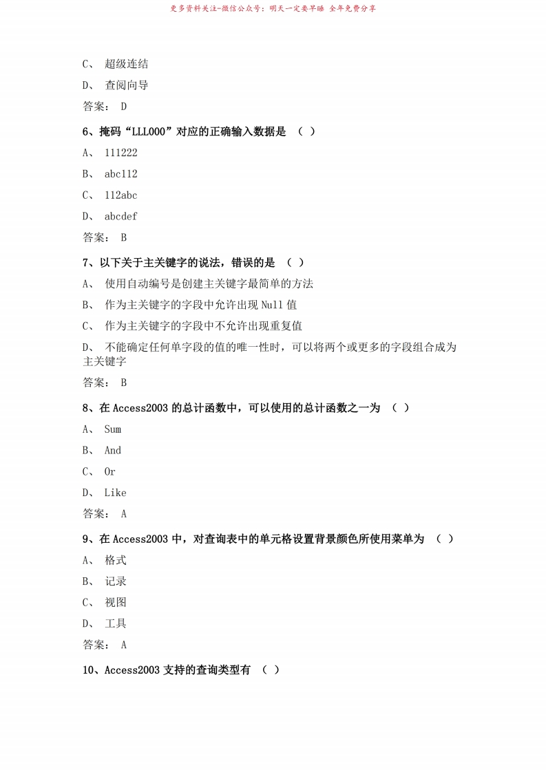 数据库应用基础-试题及答案猴哥6个月前发布关注私信2.37MB6页09724数据库应用基础-试题及答案此内容为免费资源,请登录后查看¥0 登录查看免费资源 第1页 / 共6页 第2页 / 共6页 第3页 / 共6页 该文档为免费文档,您可直接下载完整版进行阅读 © 版权声明文章版权归作者所有,未经允许请勿转载。THE END《数据库应用系统技术》学习资料合集期末复习 喜欢就支持一下吧点赞24赞赏 分享QQ空间微博QQ好友海报分享复制链接收藏