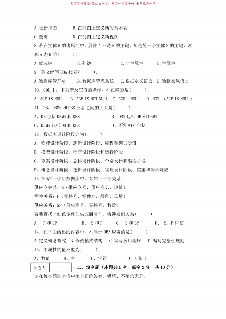 数据库应用基础期末考查试卷(A卷)及答案猴哥6个月前发布关注私信2.44MB6页03057数据库应用基础期末考查试卷(A卷)及答案此内容为免费资源,请登录后查看¥0 登录查看免费资源 第1页 / 共6页 第2页 / 共6页 第3页 / 共6页 该文档为免费文档,您可直接下载完整版进行阅读 © 版权声明文章版权归作者所有,未经允许请勿转载。THE END《数据库基础及应用》学习资料合集期末复习 喜欢就支持一下吧点赞57赞赏 分享QQ空间微博QQ好友海报分享复制链接收藏