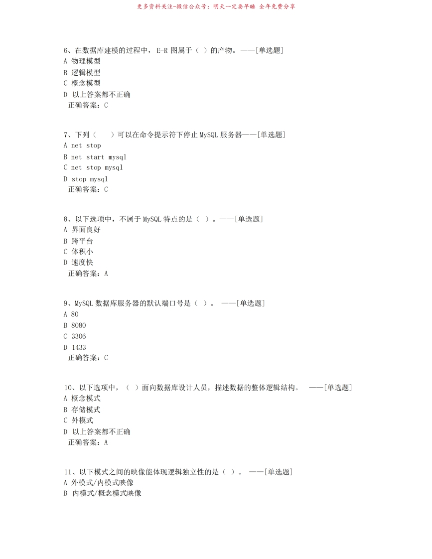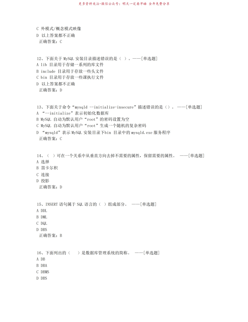 MySQL题库(552道)猴哥6个月前发布关注私信33.41MB84页09259MySQL题库(552道)此内容为免费资源,请登录后查看¥0 登录查看免费资源 第1页 / 共84页 第2页 / 共84页 第3页 / 共84页 该文档为免费文档,您可直接下载完整版进行阅读 © 版权声明文章版权归作者所有,未经允许请勿转载。THE END《mysql题库》学习资料合集期末复习 喜欢就支持一下吧点赞59赞赏 分享QQ空间微博QQ好友海报分享复制链接收藏