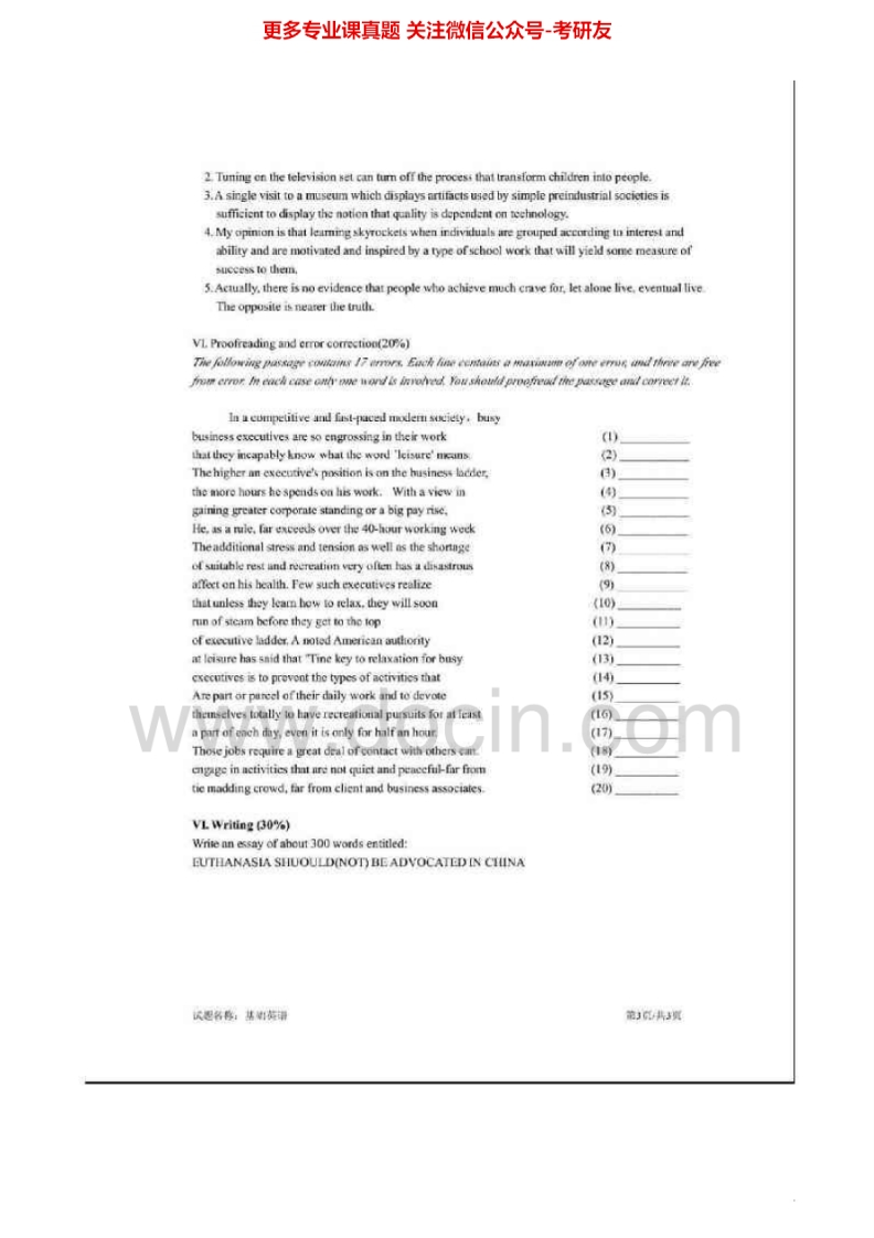 安徽大学617基础英语2003年考研真题猴哥6个月前发布关注私信1.04MB3页08147安徽大学617基础英语2003年考研真题此内容为免费资源,请登录后查看¥0 登录查看免费资源 第1页 / 共3页 第2页 / 共3页 第3页 / 共3页 已完成全部阅读,共3页 © 版权声明文章版权归作者所有,未经允许请勿转载。THE END《安徽大学》(617)古代汉语和现代汉语基础考研资料考研专业课 喜欢就支持一下吧点赞47赞赏 分享QQ空间微博QQ好友海报分享复制链接收藏