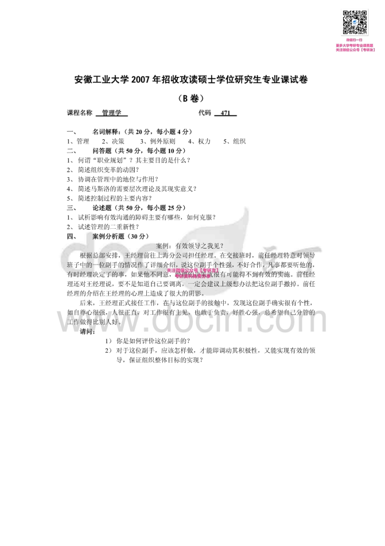 安徽工业大学871管理学2007-2008、2011、2014-2015考研真题汇编【猴哥6个月前发布关注私信0.74MB9页08035安徽工业大学871管理学2007-2008、2011、2014-2015考研真题汇编【此内容为免费资源,请登录后查看¥0 登录查看免费资源 第1页 / 共9页 第2页 / 共9页 第3页 / 共9页 第4页 / 共9页 第5页 / 共9页 该文档为免费文档,您可直接下载完整版进行阅读 © 版权声明文章版权归作者所有,未经允许请勿转载。THE END《安徽工业大学》(871)管理学考研资料考研专业课 喜欢就支持一下吧点赞35赞赏 分享QQ空间微博QQ好友海报分享复制链接收藏