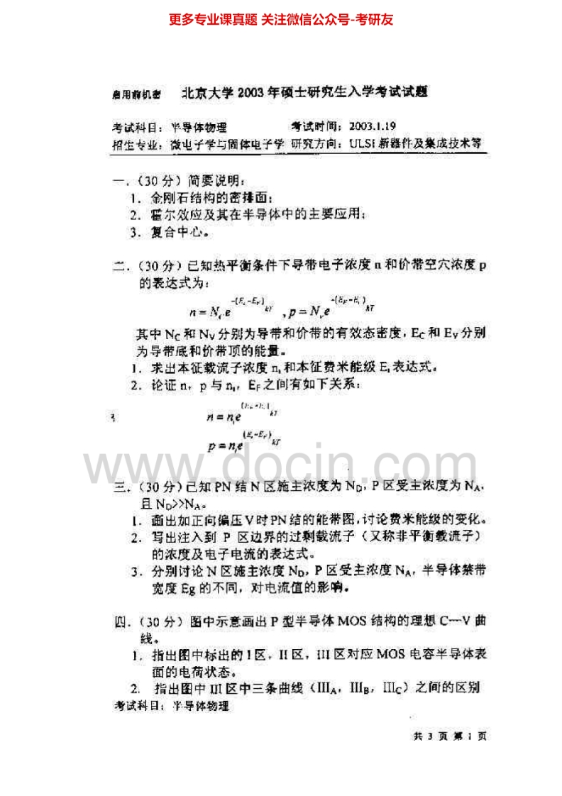 北京大学827半导体物理1998、2003考研真题汇编