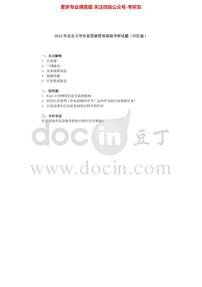 北京大学652信息资源管理基础(回忆版)2011-2012考研真题汇编猴哥6个月前发布关注私信81.71KB2页05012北京大学652信息资源管理基础(回忆版)2011-2012考研真题汇编此内容为免费资源,请登录后查看¥0 登录查看免费资源 第1页 / 共2页 第2页 / 共2页 已完成全部阅读,共2页 © 版权声明文章版权归作者所有,未经允许请勿转载。THE END《北京大学》(652)历史学基础(中国史)考研资料考研专业课 喜欢就支持一下吧点赞12赞赏 分享QQ空间微博QQ好友海报分享复制链接收藏