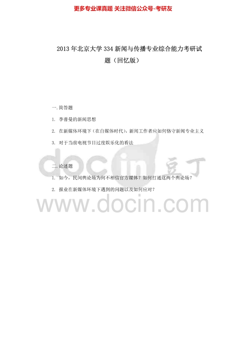 北京大学334新闻与传播专业综合能力2012-2013(回忆版)考研真题汇编猴哥6个月前发布关注私信83.79KB2页03943北京大学334新闻与传播专业综合能力2012-2013(回忆版)考研真题汇编此内容为免费资源,请登录后查看¥0 登录查看免费资源 第1页 / 共2页 第2页 / 共2页 已完成全部阅读,共2页 © 版权声明文章版权归作者所有,未经允许请勿转载。THE END《北京大学》(334)新闻与传播专业综合能力考研资料考研专业课 喜欢就支持一下吧点赞43赞赏 分享QQ空间微博QQ好友海报分享复制链接收藏