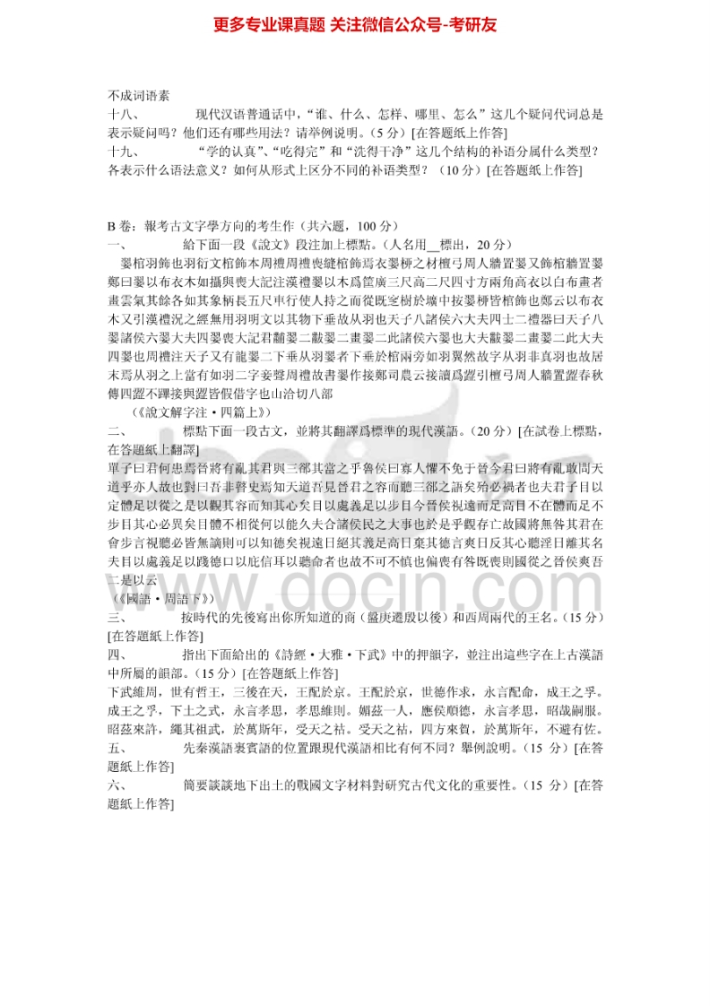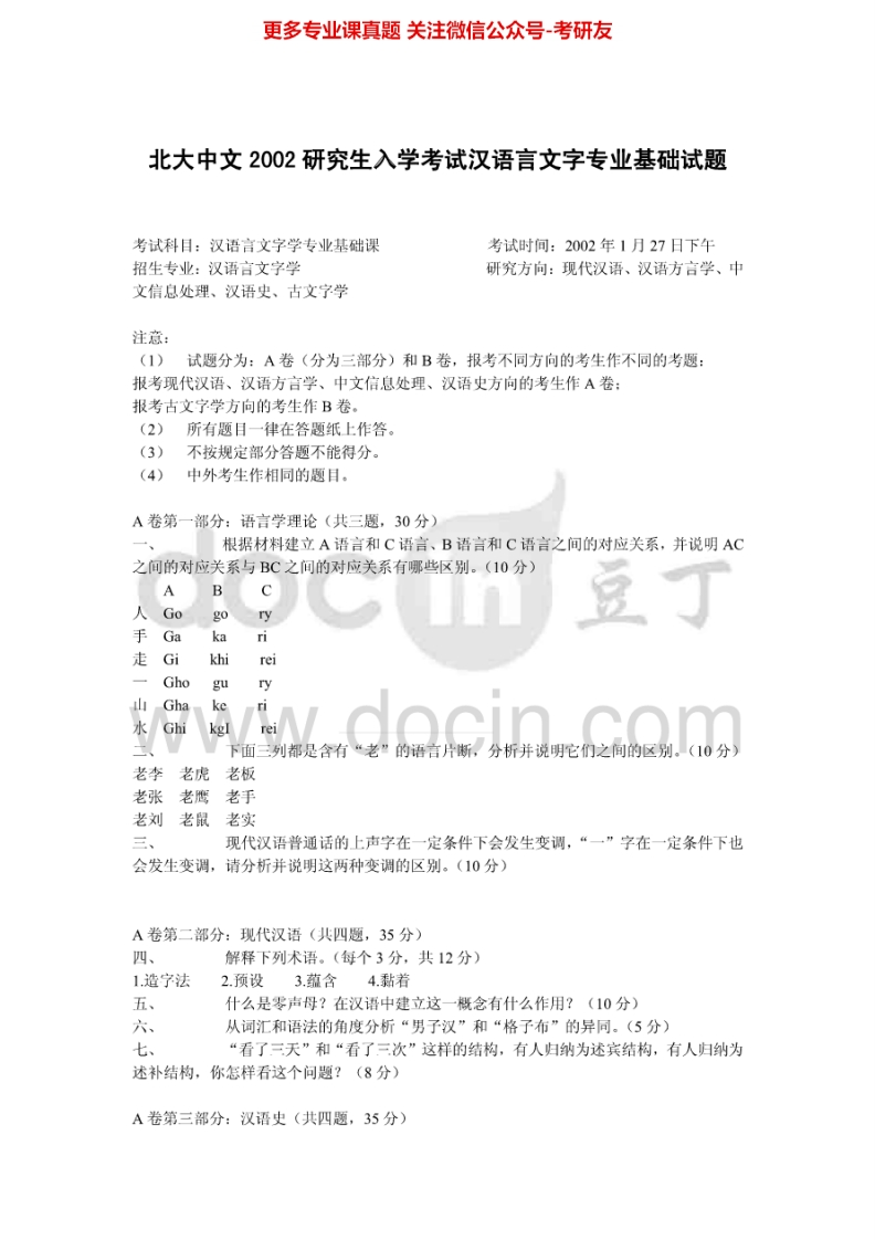 北京大学汉语言文字学汉语言文字学专业基础2001-2002、2007-2008、2010、2012历年真题考研真题汇编猴哥6个月前发布关注私信2.83MB35页07223北京大学汉语言文字学汉语言文字学专业基础2001-2002、2007-2008、2010、2012历年真题考研真题汇编此内容为免费资源,请登录后查看¥0 登录查看免费资源 第1页 / 共35页 第2页 / 共35页 第3页 / 共35页 第4页 / 共35页 第5页 / 共35页 该文档为免费文档,您可直接下载完整版进行阅读 © 版权声明文章版权归作者所有,未经允许请勿转载。THE END考研专业课 喜欢就支持一下吧点赞23赞赏 分享QQ空间微博QQ好友海报分享复制链接收藏