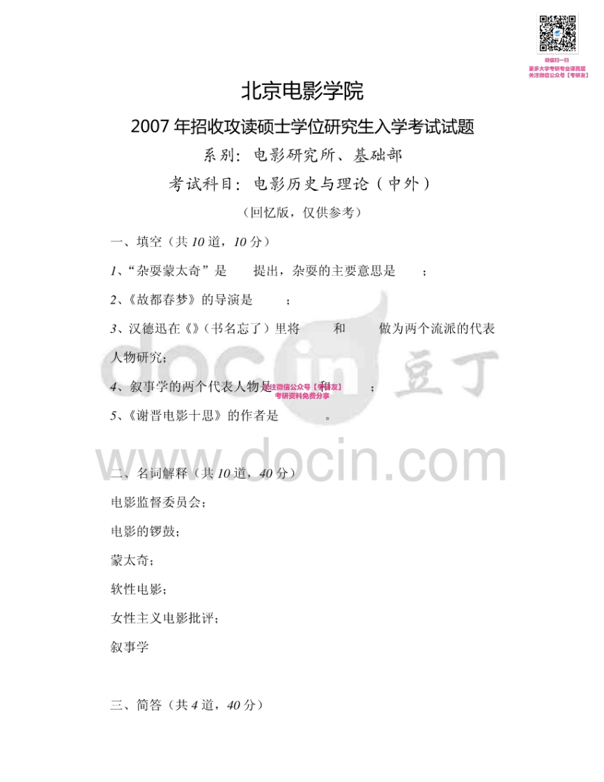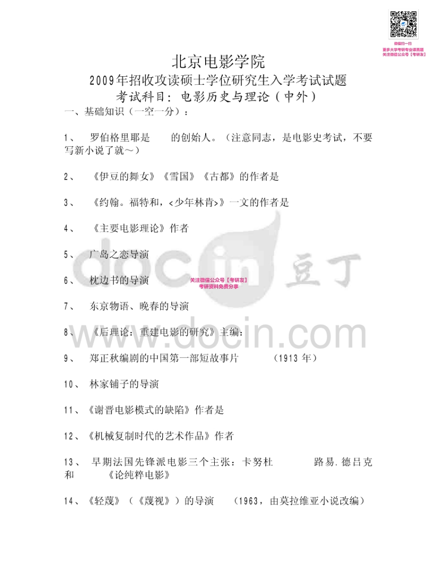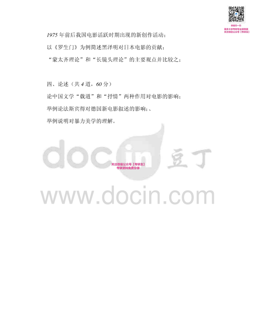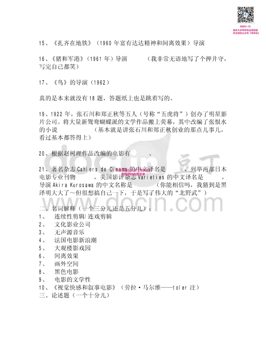 北京电影学院电影历史及理论20062007、2009(回忆版)考研真题汇编微信公众号微研社免费分享猴哥6个月前发布关注私信0.44MB7页09747北京电影学院电影历史及理论20062007、2009(回忆版)考研真题汇编微信公众号微研社免费分享此内容为免费资源,请登录后查看¥0 登录查看免费资源 第1页 / 共7页 第2页 / 共7页 第3页 / 共7页 第4页 / 共7页 第5页 / 共7页 该文档为免费文档,您可直接下载完整版进行阅读 © 版权声明文章版权归作者所有,未经允许请勿转载。THE END考研专业课 喜欢就支持一下吧点赞47赞赏 分享QQ空间微博QQ好友海报分享复制链接收藏