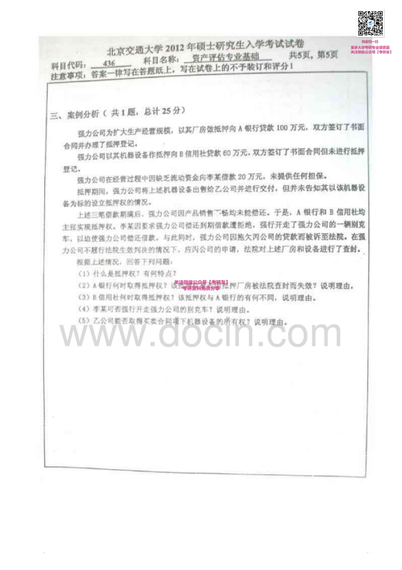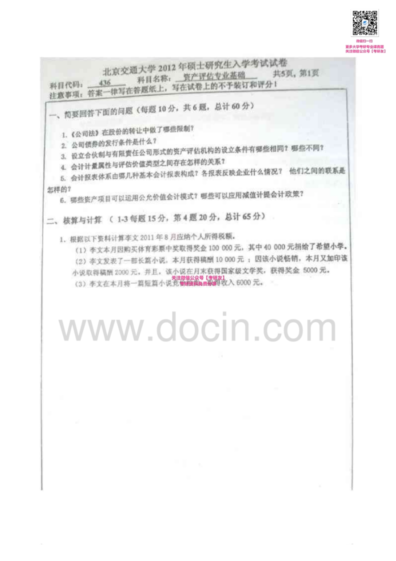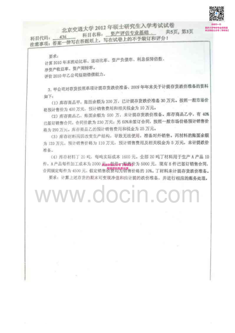 北京交通大学436资产评估专业基础[专业硕士]2011-2012年考研真题汇编微信公众号微研社免费分享-学习资源网 - 分享优质学习资料
