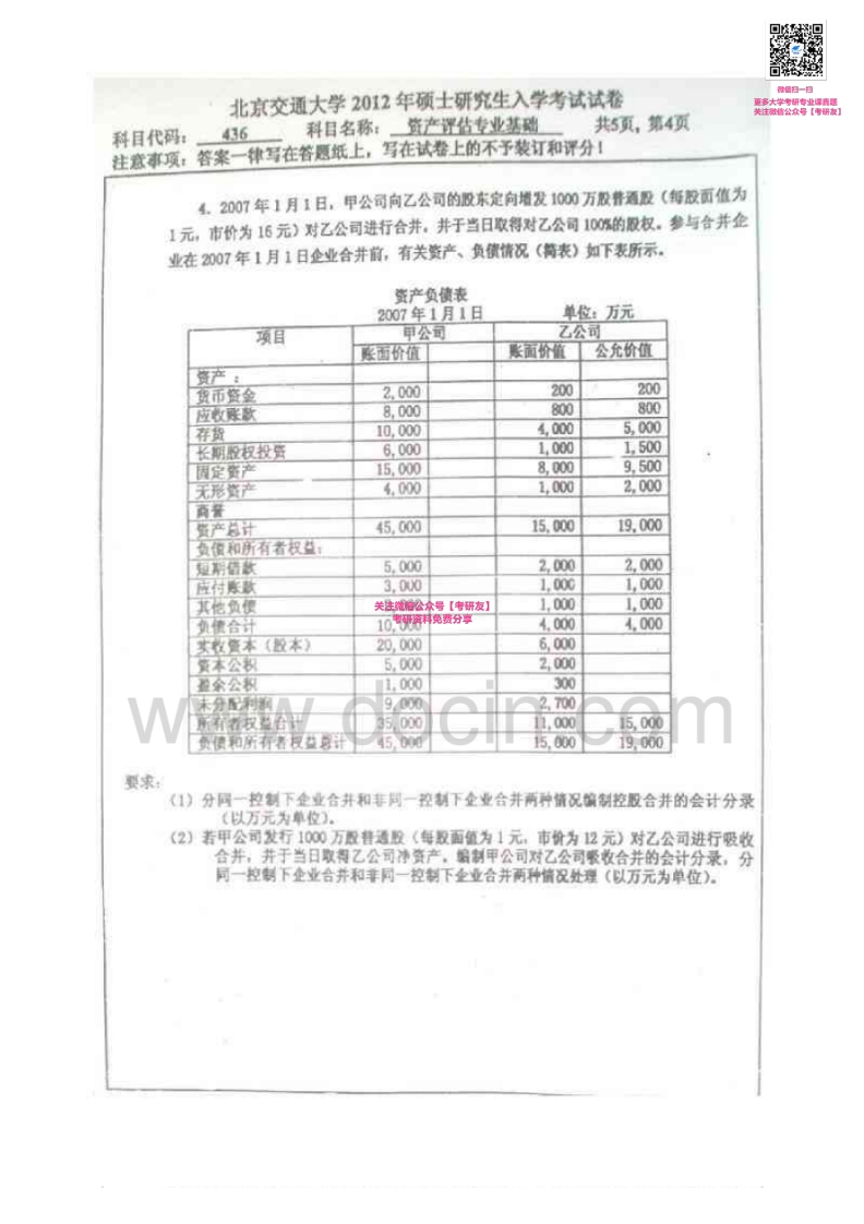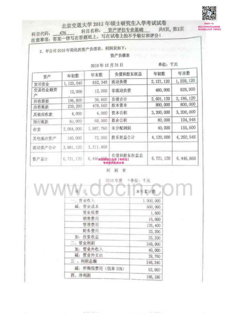 北京交通大学436资产评估专业基础[专业硕士]2011-2012年考研真题汇编微信公众号微研社免费分享