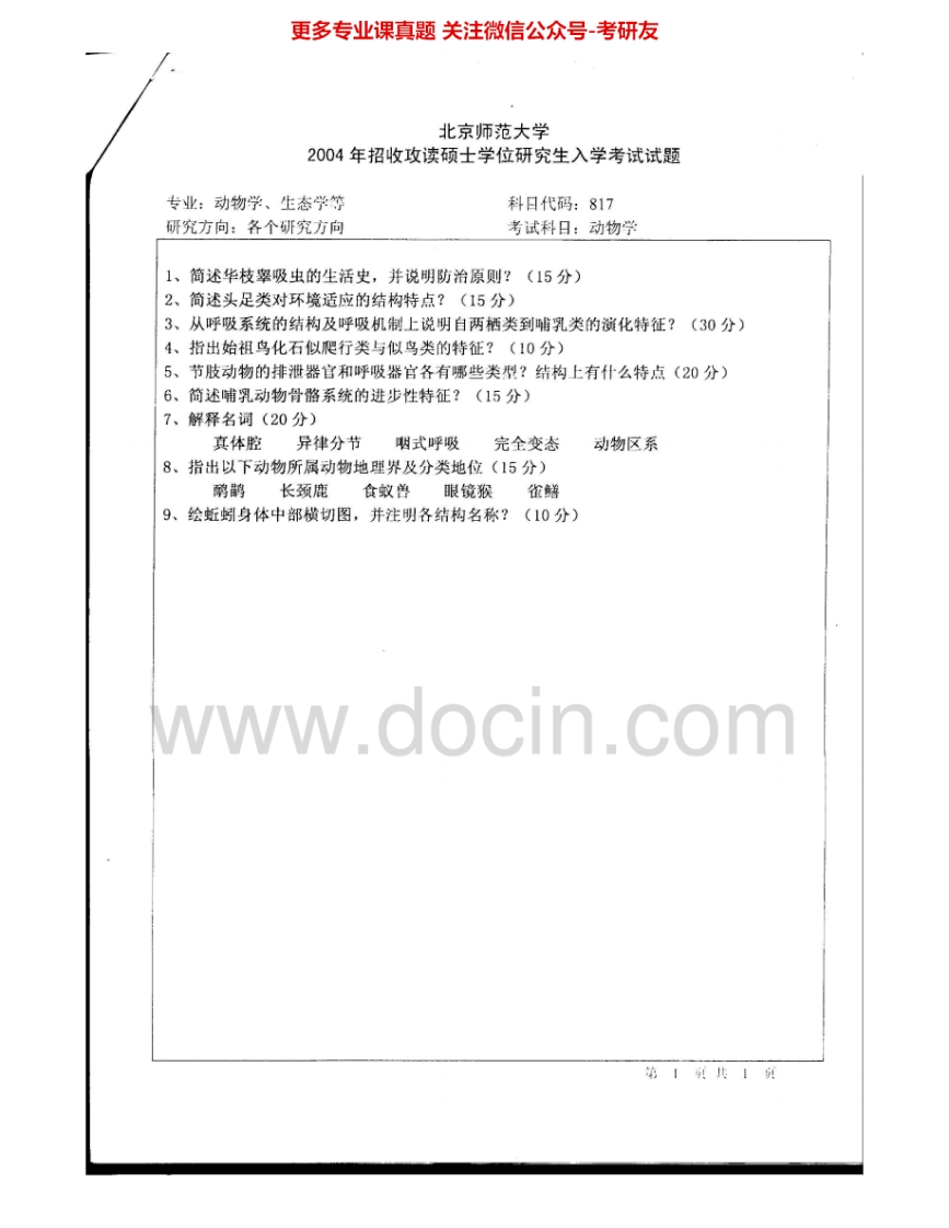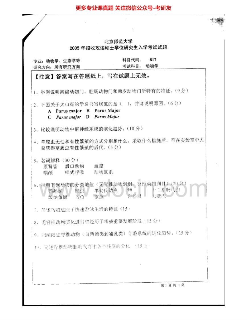 北京师范大学817动物学1999、2001-2006考研真题汇编.Image.Marked