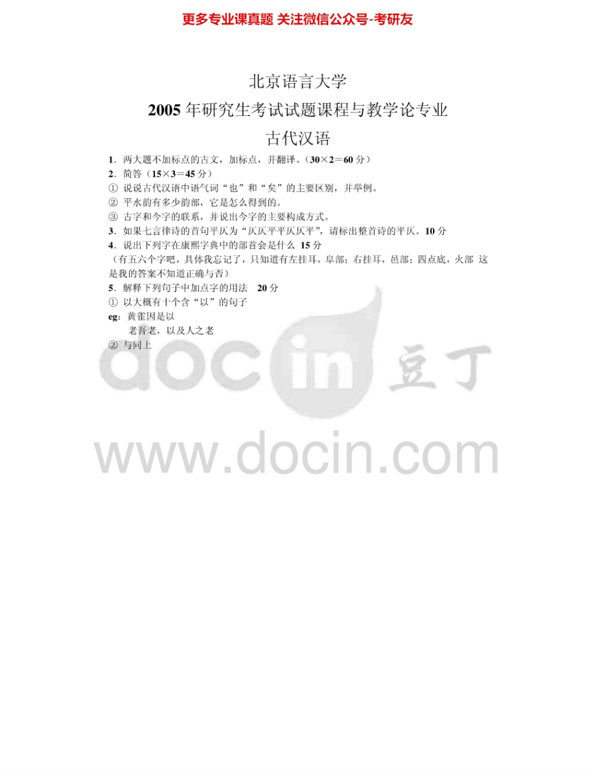 北京语言大学818古代汉语和语言学概论:古代汉语01-05语言学概论00-01、03-05考研真题汇编.Image.Marked猴哥6个月前发布关注私信1.39MB7页09213北京语言大学818古代汉语和语言学概论:古代汉语01-05语言学概论00-01、03-05考研真题汇编.Image.Marked此内容为免费资源,请登录后查看¥0 登录查看免费资源 第1页 / 共7页 第2页 / 共7页 第3页 / 共7页 第4页 / 共7页 第5页 / 共7页 该文档为免费文档,您可直接下载完整版进行阅读 © 版权声明文章版权归作者所有,未经允许请勿转载。THE END《北京语言大学》(818)人体解剖生理学考研资料考研专业课 喜欢就支持一下吧点赞13赞赏 分享QQ空间微博QQ好友海报分享复制链接收藏