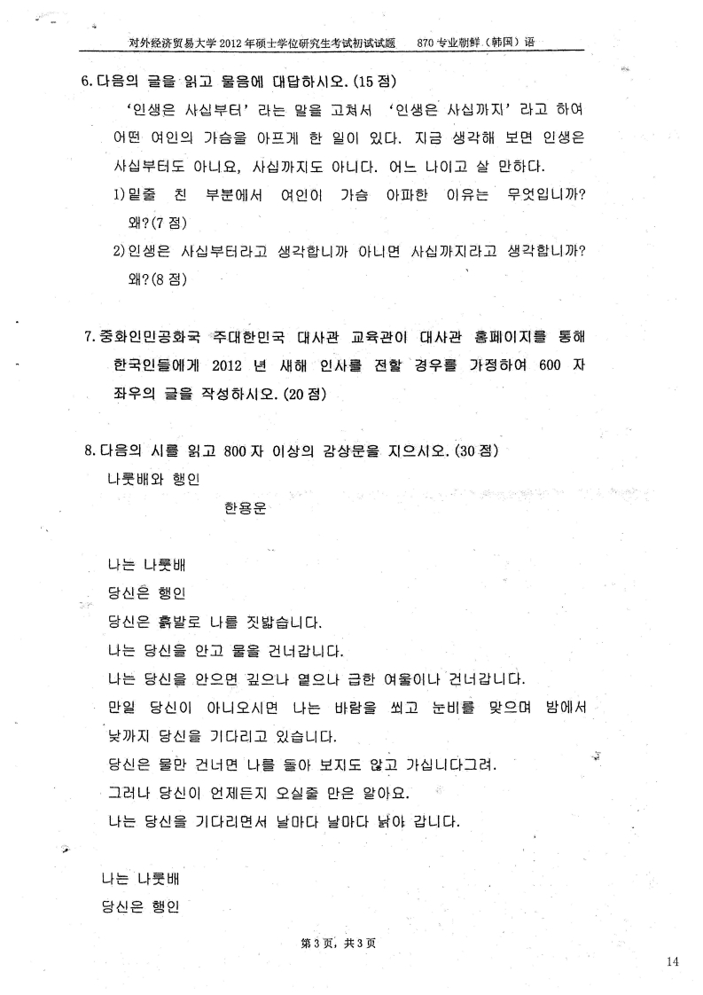 对外经济贸易大学870专业朝鲜语2012考研真题猴哥6个月前发布关注私信3.33MB3页07617对外经济贸易大学870专业朝鲜语2012考研真题此内容为免费资源,请登录后查看¥0 登录查看免费资源 第1页 / 共3页 第2页 / 共3页 第3页 / 共3页 已完成全部阅读,共3页 © 版权声明文章版权归作者所有,未经允许请勿转载。THE END《对外经济贸易大学》(870)专业朝鲜语考研资料考研专业课 喜欢就支持一下吧点赞17赞赏 分享QQ空间微博QQ好友海报分享复制链接收藏