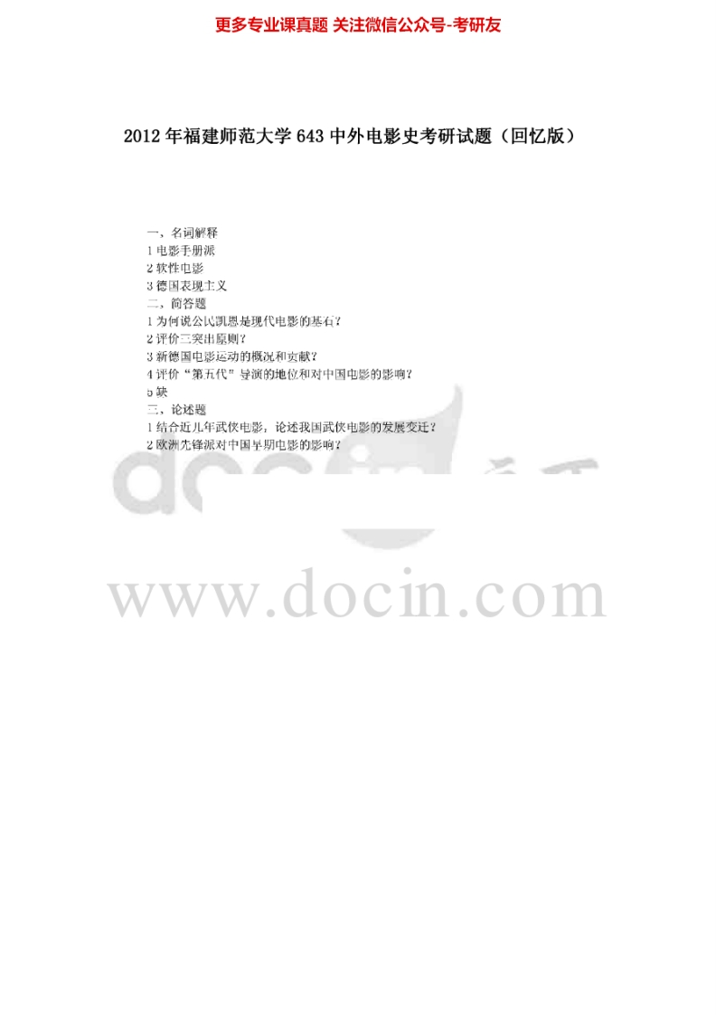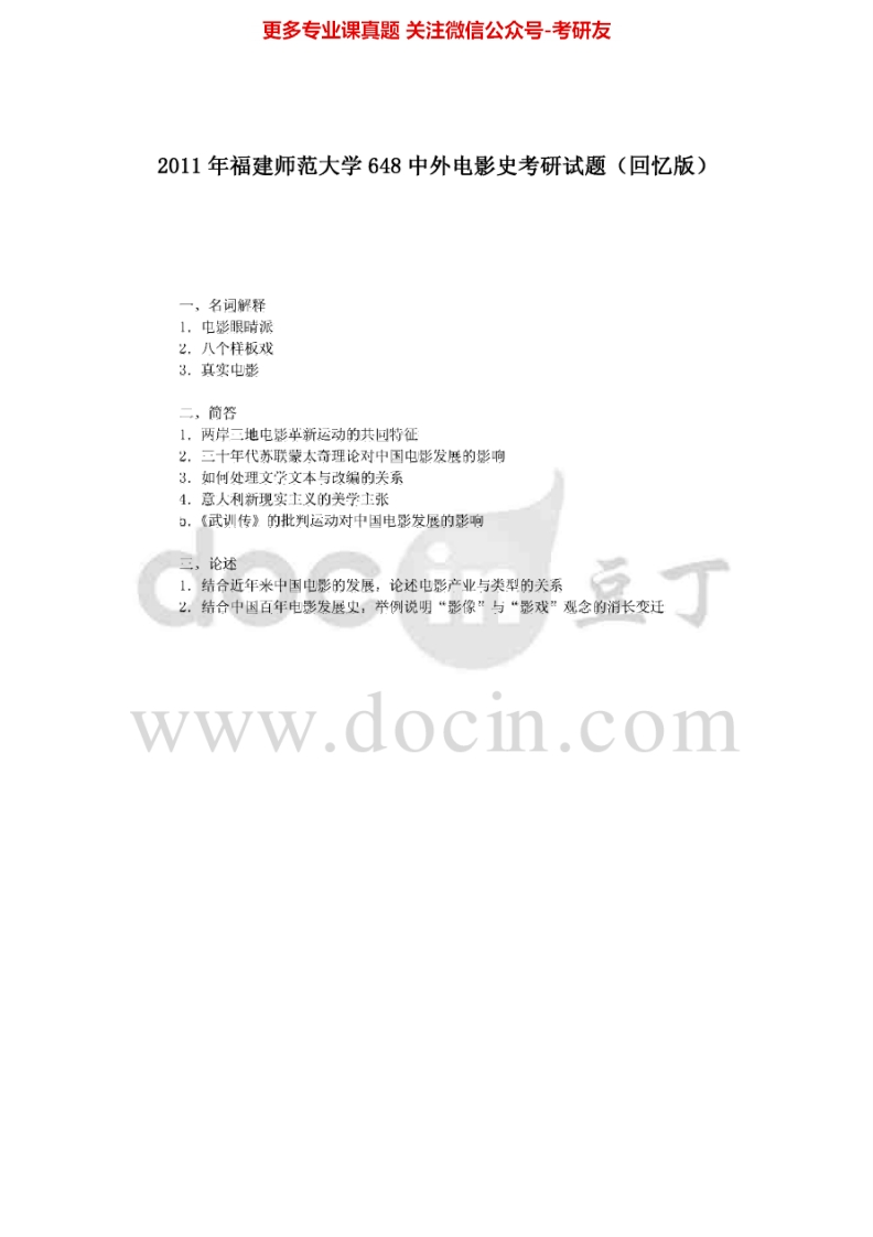 福建师范大学中外电影史2010-2012考研真题汇编猴哥6个月前发布关注私信0.12MB3页08013福建师范大学中外电影史2010-2012考研真题汇编此内容为免费资源,请登录后查看¥0 登录查看免费资源 第1页 / 共3页 第2页 / 共3页 第3页 / 共3页 已完成全部阅读,共3页 © 版权声明文章版权归作者所有,未经允许请勿转载。THE END考研专业课 喜欢就支持一下吧点赞13赞赏 分享QQ空间微博QQ好友海报分享复制链接收藏