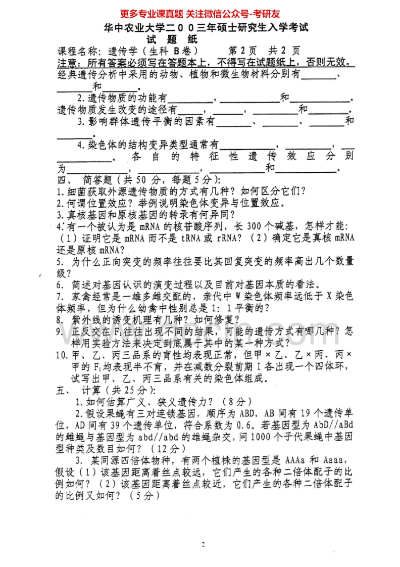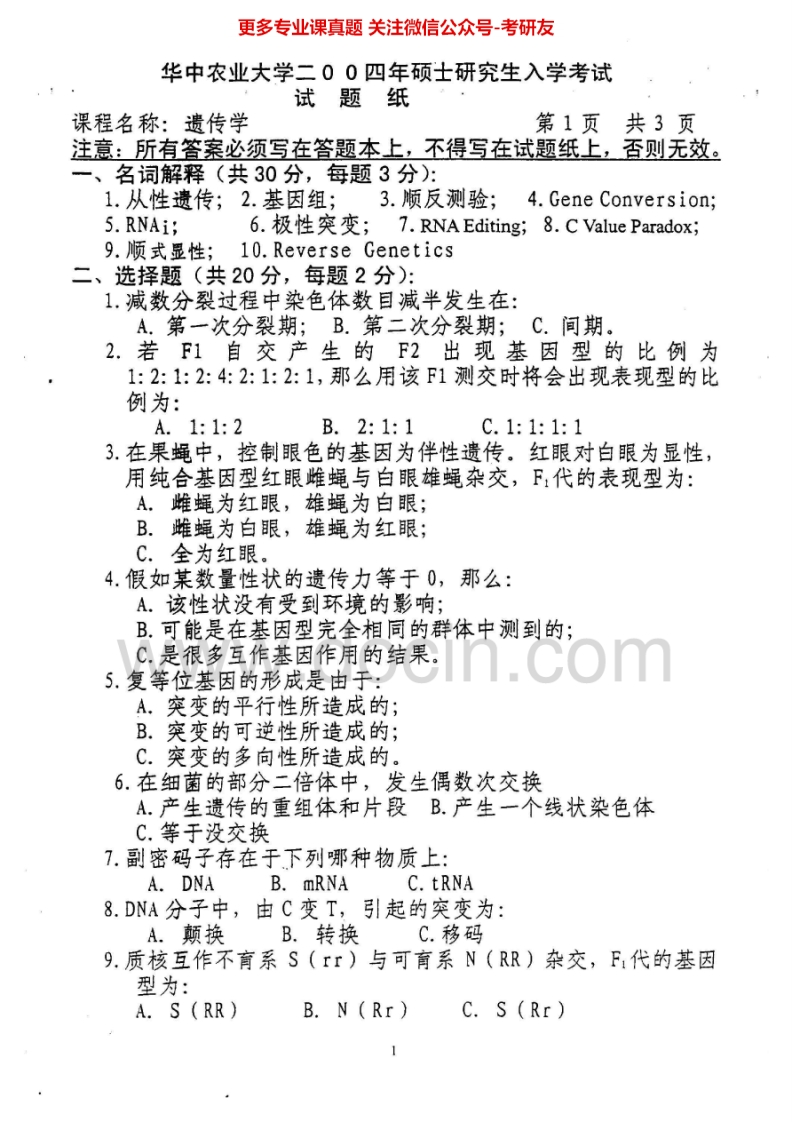 华中农业大学806遗传学2003-2005、2007-2015考研真题汇编.Image.Marked-学习资源网 - 分享优质学习资料